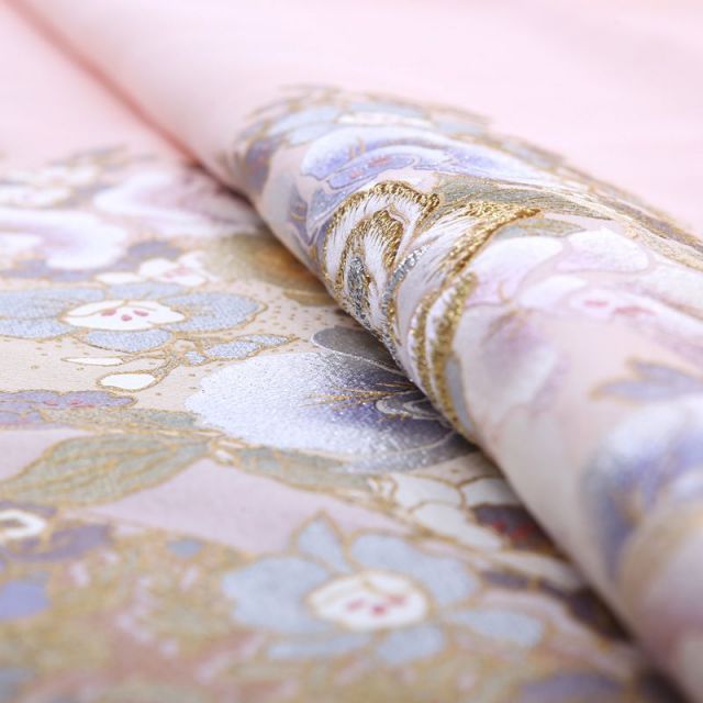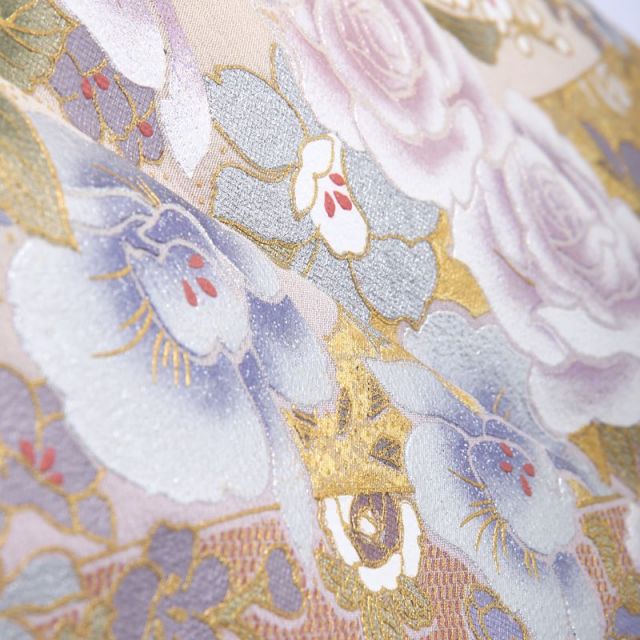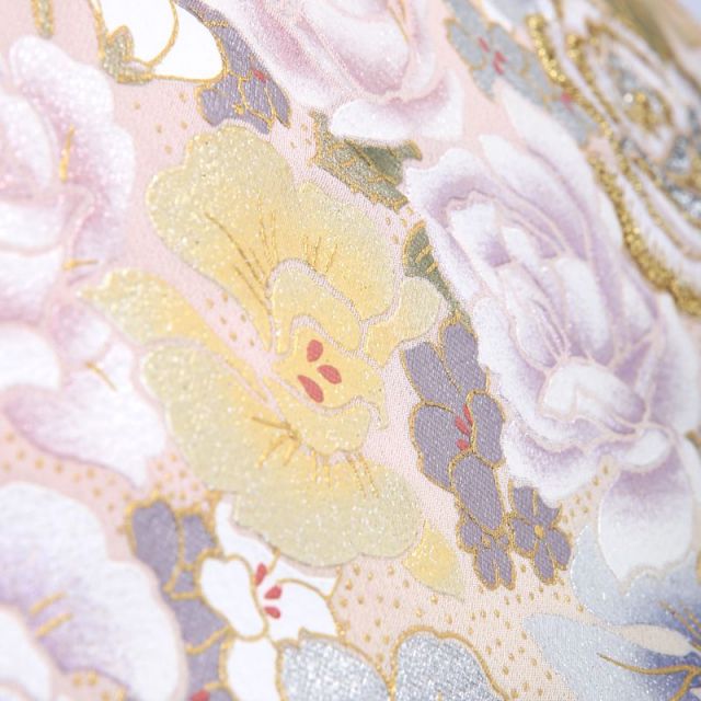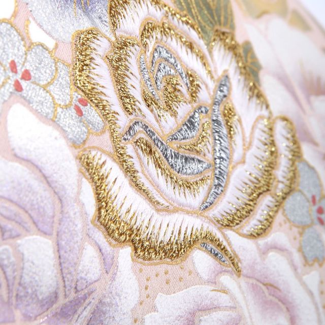 ウェディングドレスデザイナーとして著名な桂由美ブランドが贈る、薔薇の花を華麗に描いた色留袖です。西洋では愛と美の象徴とされる薔薇の花。そんな薔薇の花を、金糸刺繍、色糸刺繍、金彩、色挿しと、手法を変え色を変え、多彩な表情でたっぷりと描いています。中心に近い花ほど刺繍で豪華に、周りにいくにつれて、色彩のみであっさりと、この立体感により、着姿に奥ゆきが生まれます。西洋花の女王であり、どうしても「洋」のイメージが強い薔薇の花を、着物の中でも最も格調の高い留袖に調和させているのは、さすが桂由美。地色のオーロラピンクは、表情を穏やかに見せてくれる、微妙な加減の色味です。薔薇の花は、絵柄はボリュームもあり豪華ながら、色合いは白をベースとしており控えめ、このバランスが着物としても美しく映えるポイントといえるでしょう。帯と小物も、薔薇の絵柄と色味を合わせて、装い全体でフォーマル感を演出します。洋館などの西洋風の場所はもちろん、着物としての格調高さもあるので、どのような場所でも着映えしますね。和と洋が調和した装いで、はれの場に花を添えることのできる装いです。