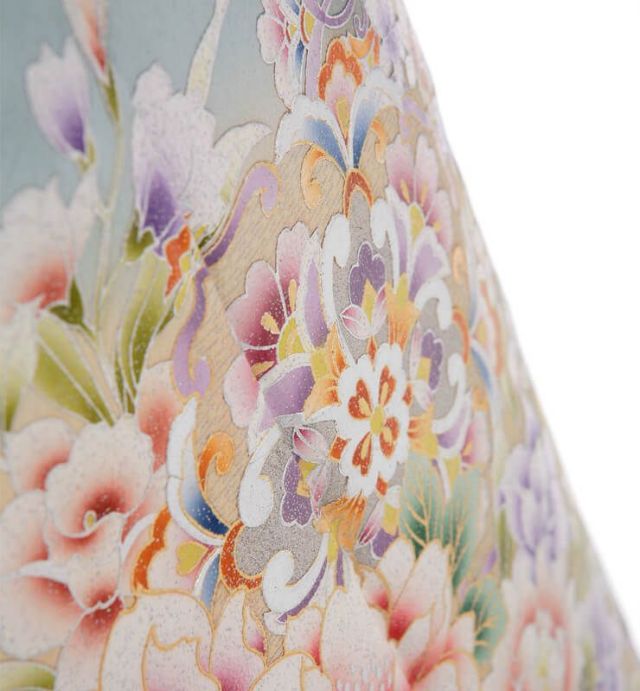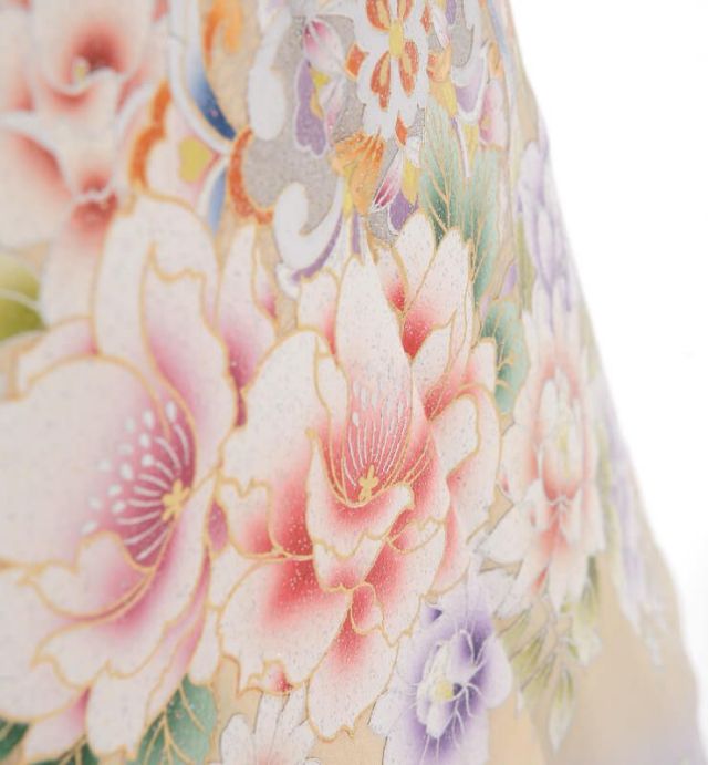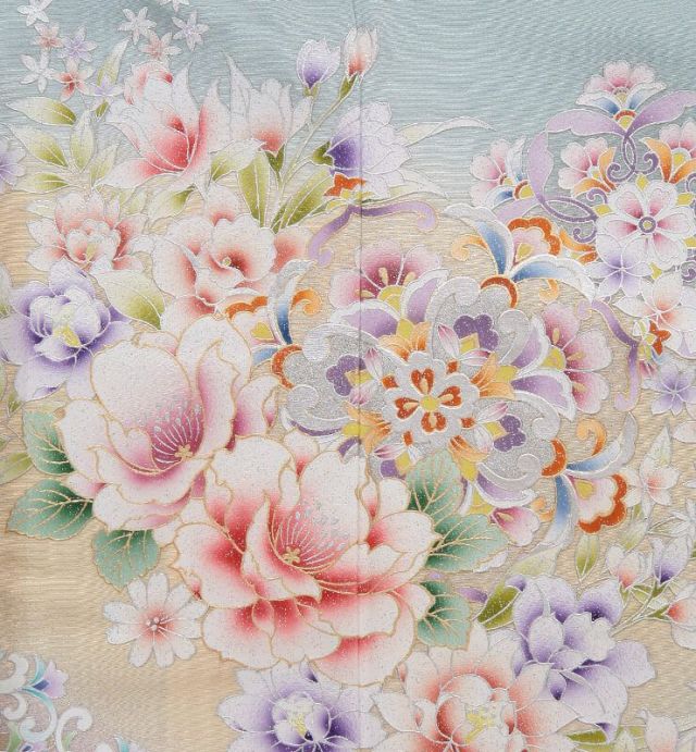爽やかでシックな緑青色の地色が上品なこちらのお着物には、豪華な金箔・銀箔ををあしらい、正統派の古典柄が見事に共演した豪華絢爛な色留袖です。中心に置かれる円形の文様は「華文」と呼ばれる様々な種類の花びらを重ねたような、花を文様化したもの。シルクロードから伝来した錦や織物にも使われており、日本でも非常に歴史の古い高貴な文様です。全体的に描かれている華やかなお花は、百花の王とも呼ばれる「牡丹」。その優雅な大輪が美しいと昔から日本人は牡丹を愛し、昔から着物の文様として使っていました。裾に近づくと、全体に唐草模様が描かれていますが、今でもよく使われる「唐草」の意味をご存知でしょうか。唐草は地面や壁に沿って広がっていくことから、生命力と繁栄を意味しているんです。そのためおめでたい席のお着物に使われることが多く、こちらのお着物も「唐花」や「花菱」と組み合わせて華やかに仕上げています。また、細かい金銀の箔使いにより、花々がキラキラと輝き、古典美をさらに深めている豪華な1着です。