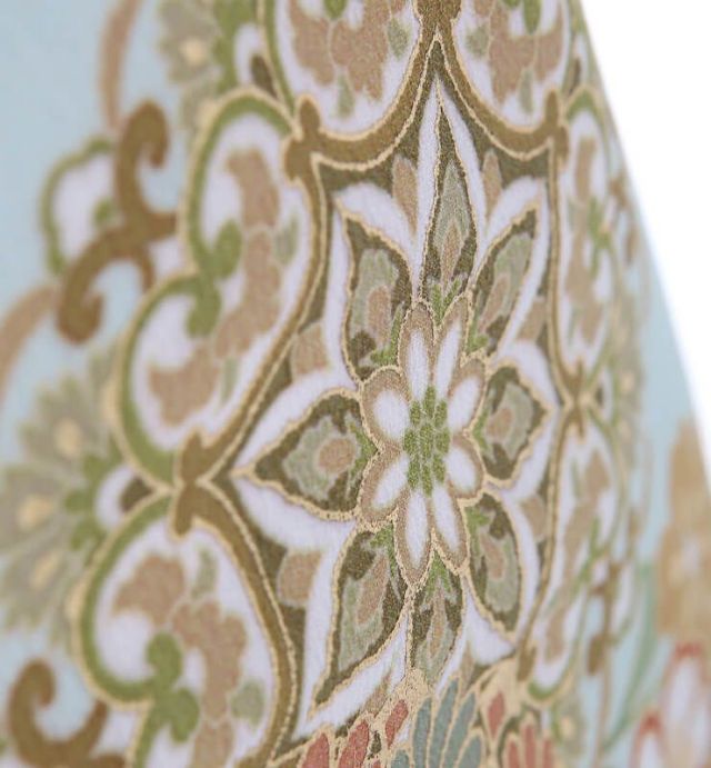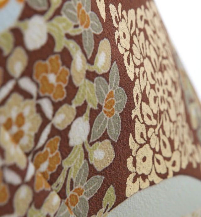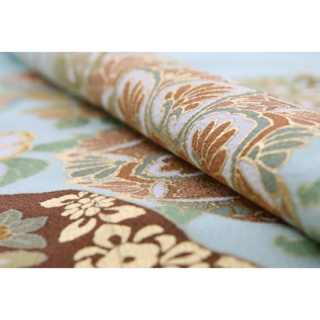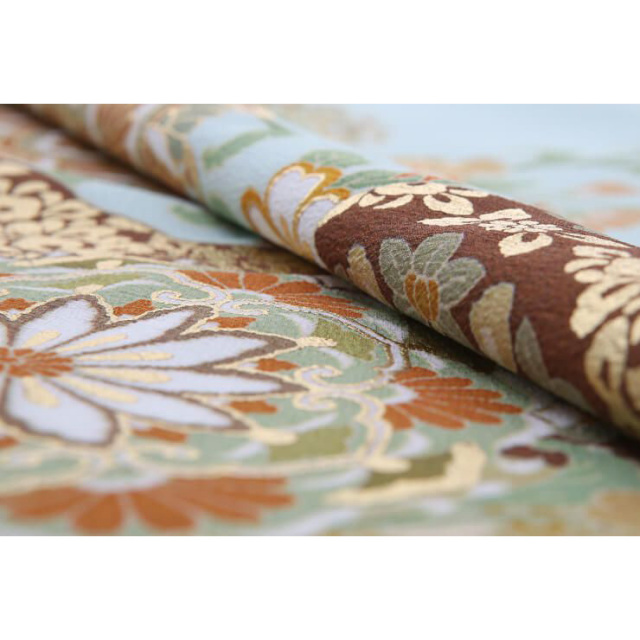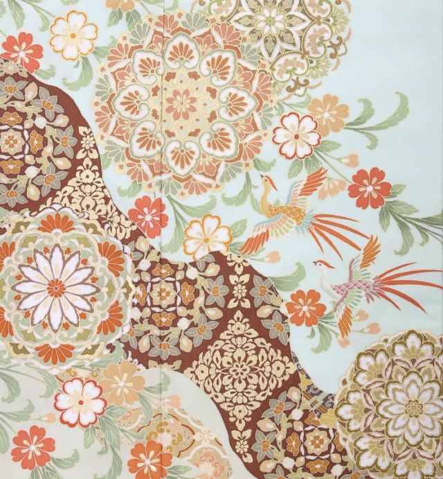 さわやかなブルーグリーンの地色に、「正倉院文様(しょうそういんもんよう)」が、お召しになる方を格調高くみせてくれる色留袖です。大きく描かれている花のような文様は「宝相華(ほうそうげ)」とよばれる文様で、唐から日本に渡り、奈良時代から盛んに文様として使われるようになりました。幻想的な花文は、エキゾチックさも加えてくれ、草花とはまた違う華やかさを持っております。また、羽ばたいている鳥は「鳳凰(ほうおう)」とよばれる瑞鳥(ずいちょう)で、良い知らせとともに現れるとされています。その鳥が何羽も描かれるという、とてもおめでたい絵柄となっております。この宝相華と鳳凰が、正倉院文様と呼ばれ、奈良の正倉院宝物殿にある、美術工芸品にまつわる文様です。奈良時代にシルクロードを渡ってきた数々の品は、その装飾も美しく、尊ばれました。この正倉院由来文様は、描かれることでおキモノを格調高くしてくれ、お召しになる人に品の良さをまとわせてくれます。 こちら人気ブランド「ジャパンスタイル」の色留袖でもあります。