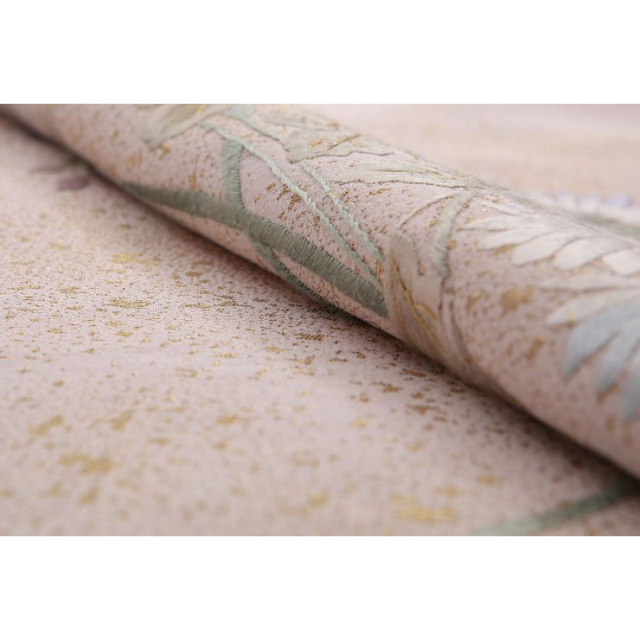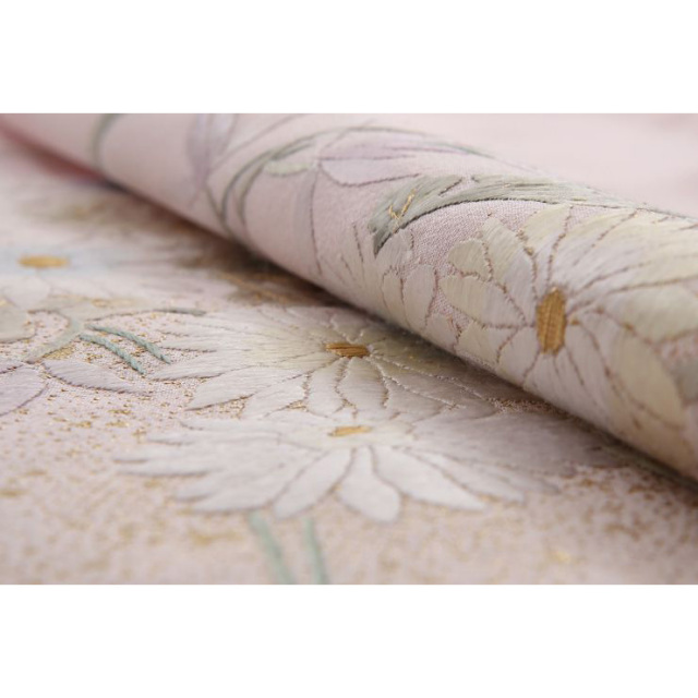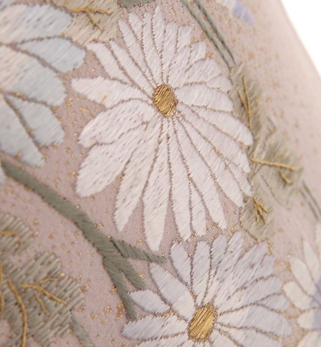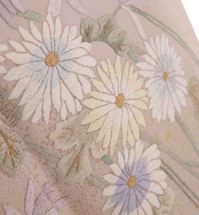 枝垂れる菊の花のラインが非常にエレガント。薄色で柄も品良く明度が高く、全体が清楚に仕上がります。柄自体の構成は大胆ですが、それぞれはとても楚々としていて、はかなげな雰囲気も漂います。色味がパステル調というのもありますし、刺繍で表現されているというのもあるでしょう。刺繍だと、控えめな光沢感が出るので、着る人の動きに合わせて美しく見せてくれます。手が込んでいる、というのも、着ていて満足感を感じる部分です。こちらの色留袖は、老舗西陣織メーカーの山口美術織物さん謹製です。皇室御用達で、その技術の高さは折り紙付きです。伝統的な技術技法を使って、このように美しいお着物も作製されています。美しいラインを描いている菊の花は、日本にもたらされてからずっと愛されてきました。品種改良が進んできた江戸時代には、比例するように文様の種類も増えました。大ぶりの花を描いたものから小菊まで、様々な描かれ方をしています。今回はわりと小ぶりな花ですね。つつましやかで淑やか、大人のかわいさを感じさせます。白い菊は「真実」「誠実な心」などを意味します。清らかな心がそのまま表れたようなお着物ですね。特別な場面でのお着物姿、繊細な刺繍で表現された美しい菊の花が、そっと背中を押してくれそうです。