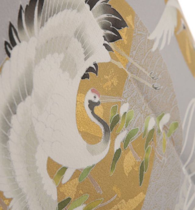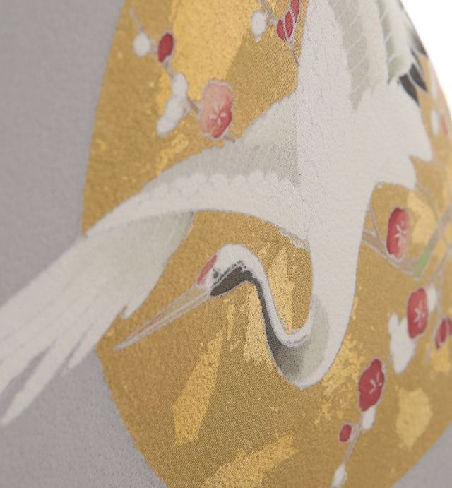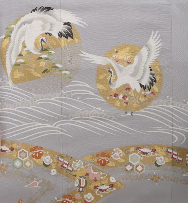 おめでたい席はやっぱり正統派の色留袖を装いたいという方におすすめの一枚です。知性を感じさせるすっきりとした地色に浮かぶのは、羽を広げた優美な二羽の鶴。鶴といえば、古くから瑞鳥として崇拝されてきました。立ち姿の神々しさ、飛ぶ姿の豪華さから、今でも格式高い場の装いに多く用いられています。男性らしさの象徴とされる松と一緒に描かれている鶴は、新郎。そして女性らしさを感じさせる梅のそばにいるのは新婦。仲睦まじく向かい合う様は、希望に満ちた二人のこれからを思わせるようです。波文がイキイキとした躍動感を加え、情景を更にドラマチックに仕立てています。波文の下には、大胆に金のラインが入り、斬新な印象。アシンメトリーなデザインに現代らしい雰囲気が漂っていますが、中に描かれているのは宝尽くしという古典文様。打出の小槌や宝巻などが散りばめられ、楽し気な雰囲気を醸しています。