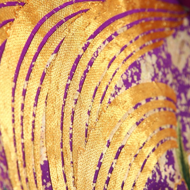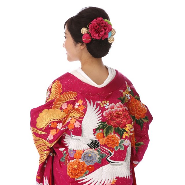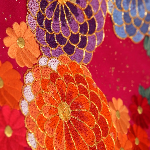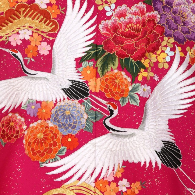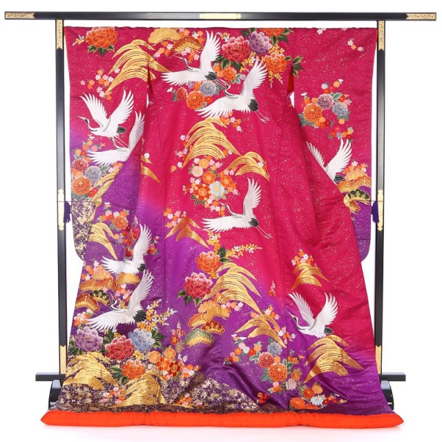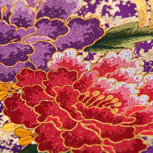 ピンクから紫へのグラデーションは、色打掛には珍しい個性的な色使いです。一見、現代風の仕上がりに感じられますが、正統派の伝統文様を上品に描いています。優雅に羽を広げて空を飛ぶ「鶴」は、最上級とも言える格式高い吉祥文様。その優雅で品のある姿から、おめでたいことが起きる前兆を意味する瑞鳥として、古くから愛されてきました。延命長寿の意味があると共に、1羽のパートナーと一生を共にする習性から、夫婦円満も表します。豪華な刺繍がほどこされた草花も、婚礼の席に華を添えます。ピンクや紫の可愛らしい色味が印象的な「牡丹」は、その大輪で可愛らしい咲き姿から、女性を表す文様として大切にされてきました。古来中国では理想郷に咲く花として特別な存在で、富貴な様子を表しています。幾重にも重なった花びらが可愛らしい「菊」は、浄化の意味があり、おめでたい席には欠かせない文様です。金色の刺繍で豪華に描かれている水の流れを表す文様は「流水」。止まることなく流れ続ける流水は永遠の人生を象徴し、いつまでも穏やかな人生が続きますようにという思いが込められています。そして着物全体に散らされた金箔が高級感をプラスし、モダンと古典が融合したゴージャスな色打掛です。