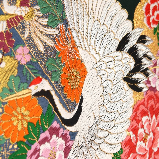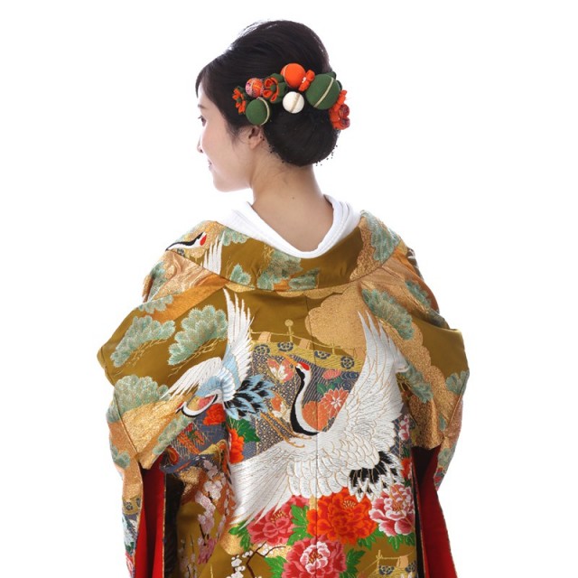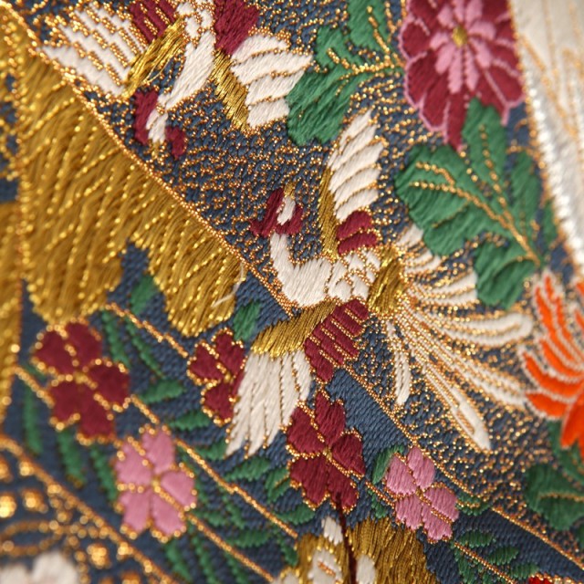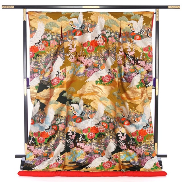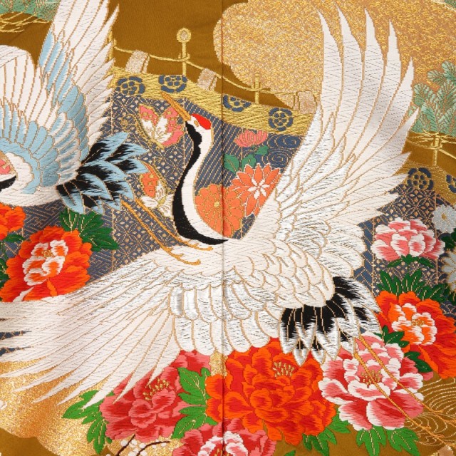 煌びやかなゴールドが印象的なこちらの色打掛は、縁起が良い伝統文様がたくさん描かれている正統派のデザインが魅力的です。大きな白い羽を広げて飛び立つのは「鶴」。その気品溢れる姿は、おめでたいことがきる前兆であり、延命長寿を象徴するとされてきました。また1羽の相手と一生を添い遂げる習性から、夫婦円満を意味するとして婚礼の席にふさわしい文様です。その周りに描かれる「牡丹」や「梅」は赤やピンクなどの鮮やかな色を使って豪華に描かれています。気品ある女性の象徴ともされる「牡丹」は、古来中国の言い伝えでは理想郷に咲く花とされ、花嫁の幸せな人生への願いが込めらた文様です。「梅」は寒い冬の間に美しい花を咲かせることから、忍耐や繁栄を意味します。ゴールドを使って描かれる雲は「瑞雲」とも呼ばれる吉祥文様です。繁栄を表す「松」とともに描くことで、気品がさらに感じられ、高級感溢れる仕上がりになっています。婚礼という新たな門出を色打掛全体で表現した素敵な1着です。