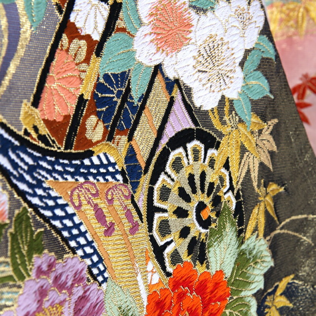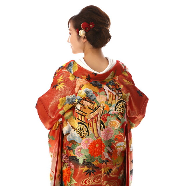 色打掛全体から受けるキラキラと輝く印象は、縦糸に金の糸を使う豪華な佐賀錦の技法によるもの。贅沢で上品な金糸使いが気品を感じさせます。細かに描かれる伝統文様は、どれも縁起がよく、品格あるものばかりです。平安時代に貴族が乗り物として使っていた「御所車」は、当時の繁栄と優雅な生活を物語る上品な文様とされています。周りには繁栄を意味する「松」や「竹」、災いから身を守ってくれる「菊」、そして女性の富貴な様子を象徴する「牡丹」などどれも古くから大切にされてきた植物の文様ばかり。また庭園の小川の流れを表現したかのような「流水」の文様も金色でゴージャスに描かれています。水は止まることなく流れ続けることから、穏やかな人生がいつまでも続きますようにという願いを込め、永遠の意味を持った文様です。おめでたい意味を持つ伝統文様を使い、美しい庭園を表現した豪華絢爛な色打掛です。