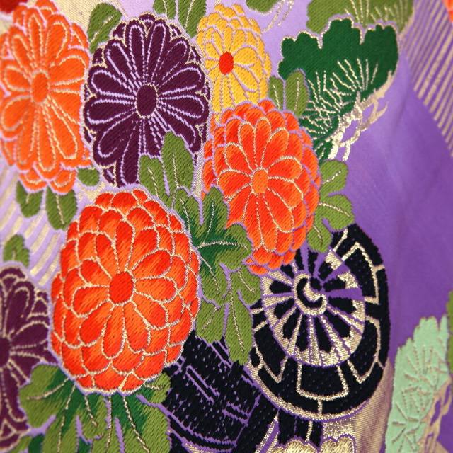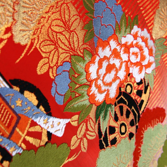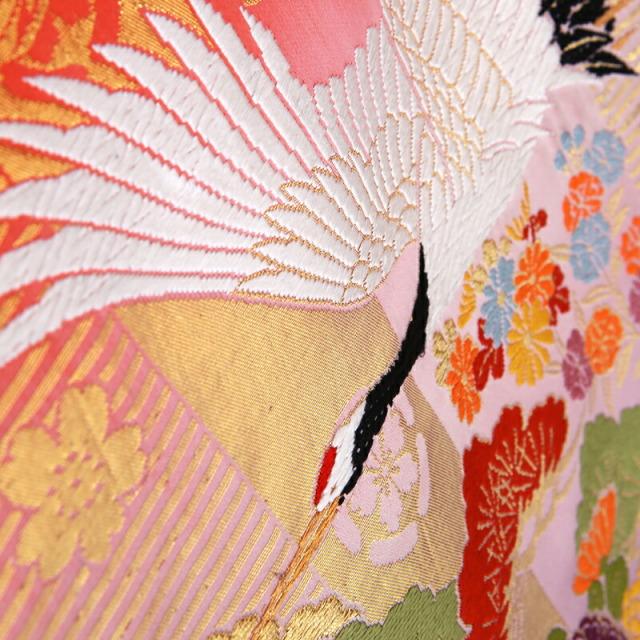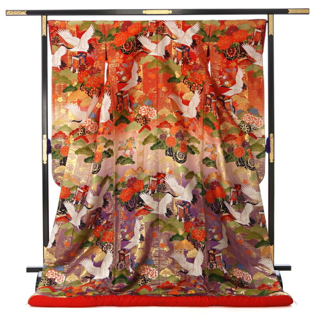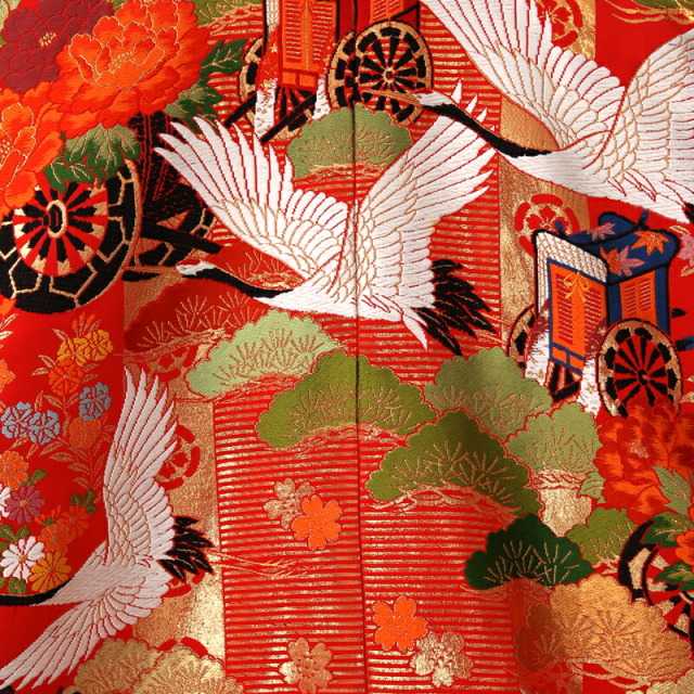 落ち着いた大人の女性を感じさせる紫と赤のぼかしや、全体の煌びやかなゴールドが豪華なこちらの色打掛には、伝統文様がたくさん描かれ、婚礼の喜びを表現しています。背中に大きく描かれるのは縁起が良い文様の象徴である「鶴」。日本人は古くからその優美に飛ぶ姿や純白の羽を特別なものと考え、瑞鳥として大切にしてきました。延命長寿の意味があると知られていますが、実は夫婦円満の意味もあります。「鶴」は一度夫婦になった1羽の相手と一生を過ごす習性があると言われています。そのため夫婦仲良く一緒に暮らしていけますようにという願いが込められています。また草花の文様も縁起が良いものばかり。「松」は年中緑を絶やさないことから繁栄や健康を意味し、植物の中でも一際縁起の良い存在です。「牡丹」はその大輪で富貴に咲く姿から、女性の気品を象徴しています。加えて平安時代の乗り物を表現した「御所車」や「花車」は、貴族の優雅で上品な生活を表現しており、文様全体で伝統と品格を表現した豪華な仕上がりの色打掛となっています。
