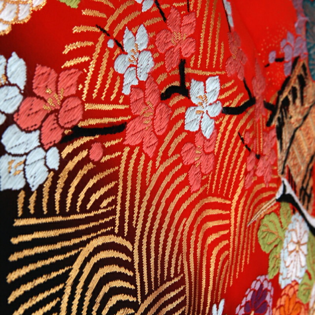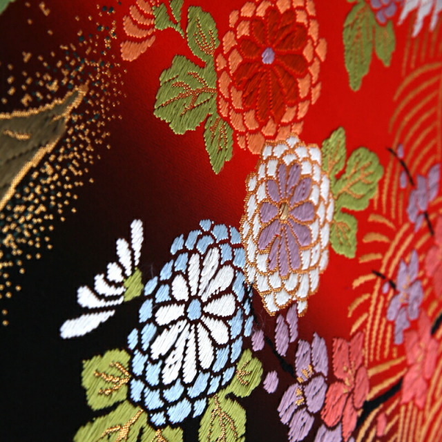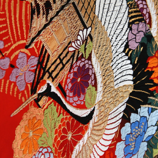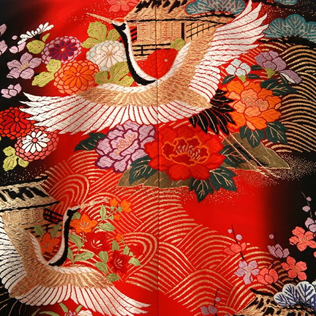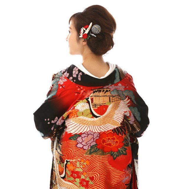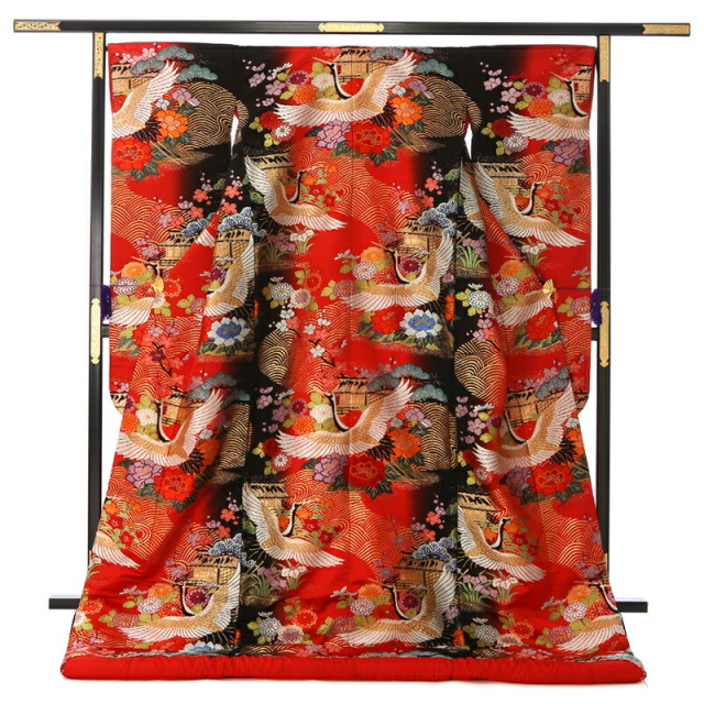 黒と赤の鮮やかな色合いがクールで元気な印象を与えるこちらの色打掛には、伝統文様がたくさん描かれています。まず一番に目に留まる大きな羽を広げた「鶴」は縁起が良いことを予感させる瑞鳥とされ、繊細でダイナミックな姿に品格があると古くから大切にされてきました。延命長寿を意味する文様ですが、婚礼の席にふさわしい夫婦円満という意味もあります。1羽のパートナーと生涯共に過ごす習性があり、いつまでも夫婦仲良く暮らせますようにという願いが込められています。様々な草花も描かれていますが、特に大きく描かれる「牡丹」は女性の気品を表す文様です。百花の王とも呼ばれるほどその富貴な姿は格別の美しさがあり、理想郷に咲く花と言われることから、花嫁の幸せへの願いが込められています。金色を使って描かれる水が流れている文様は「流水」です。水の流れは絶えることなくずっと続くので、水のように平穏で幸せな生活が続きますようにという願いが込められています。正統派の古典美を個性的なぼかしで華やかに描いた色打掛をお楽しみください。