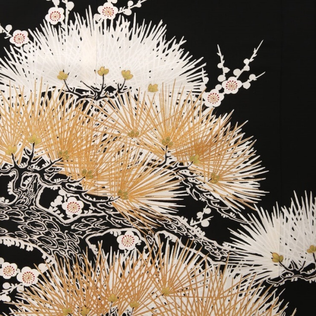 こちらは、京友禅競技大会受賞柄の黒留袖です。松の枝ぶりが広がるほど祝福の喜びと品格に満ち溢れる逸品となっています。おめでたいしるしの吉祥文様の中でも、格の高い松文様。常盤(ときわ)色といわれる常緑樹の松は、厳しい冬でも緑色を保つ『長寿』と『節操』の象徴です。松の柄があるだけで威厳や風格を感じさせるので、他の柄の周りに描かれたお着物が多いでしょう。しかしながら、松だけを大胆に、そして色を厳選させた黒留袖は、なかなか見かけるものではありません。金彩加工が施された金の針松。雪がかかっているような純白の針松。白い縁取りで描かれた力強い枝。しびれるぐらい潔い色使いと伝統技法は、黒留袖にまばゆいばかりの美しさを放ちます。所々に配された白く小さな梅が、威厳あるお着物に可憐な美しさを与えています。まさに最高格の黒留袖。お祝いの華やかなお席に、こちらの装いで登場すれば、目に留まった人は思わず、感嘆のため息がでてしまうことでしょう。