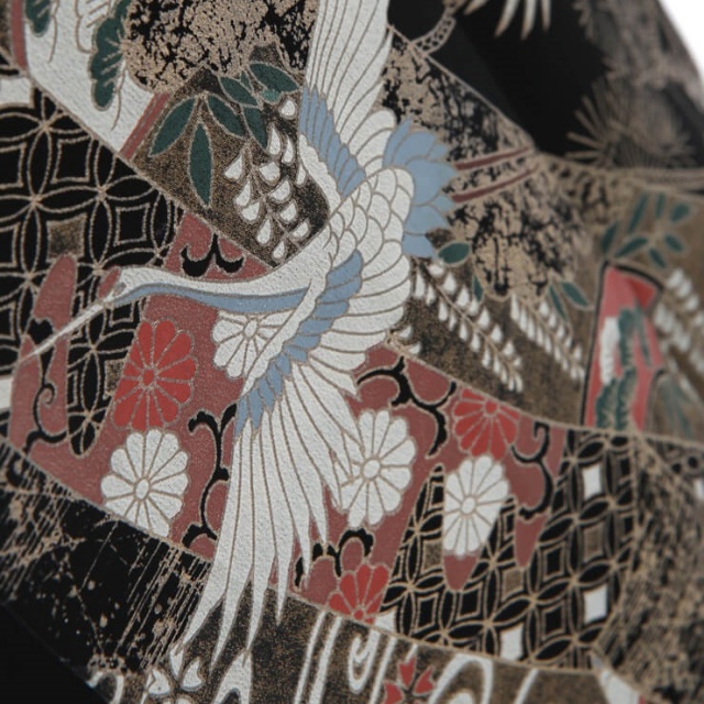 高貴で雅な姫君を思いおこさせる「几帳(きちょう)」と、その上を舞う「鶴」が美しいおキモノです。几帳とは、平安貴族が使用していた、室内の空間を仕切るためのものです。姫君を人の目から隠す役割をしていました。そこにかけられた、帳(とばり)とよばれる薄絹の1つ1つに、吉祥の草花や、貴族の装束文様であった「有職文様(ゆうそくもんよう)」が、ていねいに描かれ優雅さを感じさせています。それが風に舞う様子も、躍動感と奥行きを生み、とても美しい絵柄となっております。その几帳の上を、美しく描かれた鶴が舞い飛びます。鶴は、長寿を表し、おめでたい文様ですので、晴れの日のお召し物としてとても人気があります。また、こちらは小さい方向けのサイズとなっておりますが、落ち着きのあるお色目ですので、体形を気にすることなくお召しになっていただけます。さらに、年代を問わず、華麗であるとともに上品な印象を与えてくれるおキモノです。