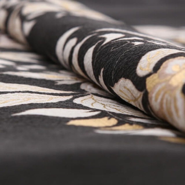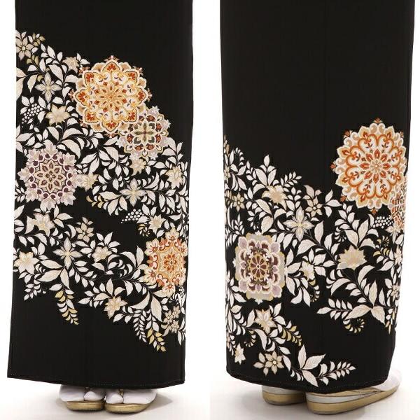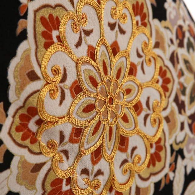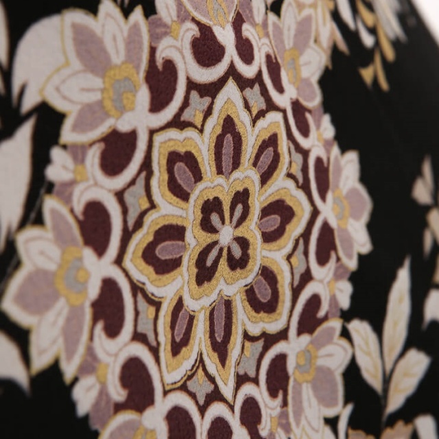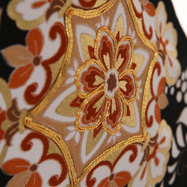 お祝いの日取りが決まれば、ミセスにとっても心躍る支度が始まります。中でも黒留袖選びは、特別の楽しみ。新郎新婦やゲストを引き立てつつ、品の良さを印象づける柄行を選びたいものです。京都の伝統工芸として名高い京友禅の競技大会で輝かしい賞を獲得した黒留袖なら、そんなご要望にぴったり。全体的にシックな色味でまとめられているので、初めて黒留袖をお召しになるミセスにも選びやすい柄行きです。黒の地色を活かし、唐花文様を白抜きのように浮かび上がらせる珍しい趣向。ところどころに金彩を入れることで華やぎを加えています。存在感のある花たちの周りを囲む葉の一枚一枚からも躍動感が伝わってくるようです。情景のアクセントに用いられているのは、大きな宝相華文。まるで万華鏡のような美しい世界を見せています。繊細なタッチで表現された宝相華文は細やかな刺繍が施され、金の光沢が優美。柿色や菖蒲色など奥深さのある色味を使うことで、より格調高い雰囲気を醸します。