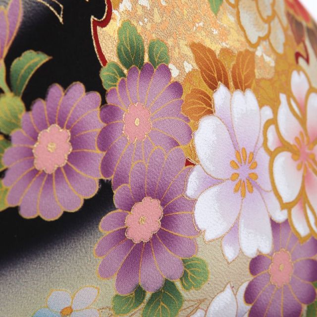 雪輪がリズミカルに散らされ、その雪輪の周りに色とりどりの花々が描かれた、明るく華やかな黒留袖です。大小取り混ぜてリズム良く散らされた雪輪。雪輪は雪の結晶を丸くかたどった日本古来の文様です。雪の結晶というと冬向きなのではないかと思われる方もいらっしゃいますが、あるまで意匠化された文様であり、特に中に綺麗な古典文様や絵柄を詰めて枠取りのデザインとして使われるものは、季節を問いません。描かれた花は、牡丹、菊、桜、桔梗。牡丹は、中国で唐の時代に百花の長として愛でられており、それが日本に伝わりました。平安時代の着物や室町時代の裂(きれ)にも見られる、古くからの文様です。菊の花は長寿や不老の象徴であり、別名を千代見草といいます。こちらの黒留袖は、春秋の花が描かれていますが、単衣の時期にお召しになれば、菊や秋草が目をひき、夏から秋に相応しい装いと感じてもらえることでしょう。背景にほどこされた朱色からクリーム色へのグラデーションが、より一層優美な雰囲気としてくれますね。多くの人が集まる晴れの席で、遠目にも映える華やかな黒留袖です。