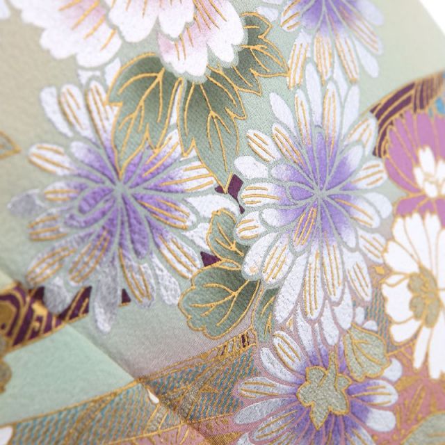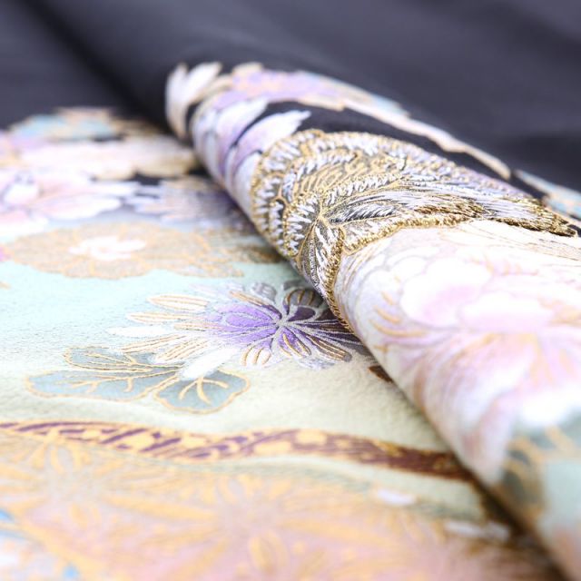 古典的な和の意匠をふんだんに用いながら、描き方により洋の雰囲気をまとわせた、和洋折衷の魅力が桂由美らしい黒留袖です。描かれているのは、牡丹、桜、菊などの日本の花々と、七宝、蜀江(しょっこう)、流水といった古典文様。それが、全体を見るとドレスのような洋風の雰囲気にも見えるのは、ウェディングドレスを中心に活躍しながらも、着物の世界にも造詣が深い、桂由美ならではといえるでしょう。牡丹や菊は、写実的になりすぎず少し洋の雰囲気を取入れて意匠化し、どこか薔薇やデイジーを思わせるような描き方。日本を代表する桜の花も、ラベンダー色や薄いターコイズ色で彩ることで、桜と強く主張しないデザインに。七宝などの古典文様は、繊細で透け感のある描き方により、レースのような雰囲気となっています。和の場面、洋の場面、どちらでお召しになっても、周囲と調和してくれる装いです。全体の色遣いも穏やかで上品ですが、菊に使われた淡いラベンダー色が、清楚な雰囲気を演出してくれると共に、単衣の時期の目に涼やかに映りますね。涼やかに、清楚に、夏の晴れの日を演出してくれる装いです。