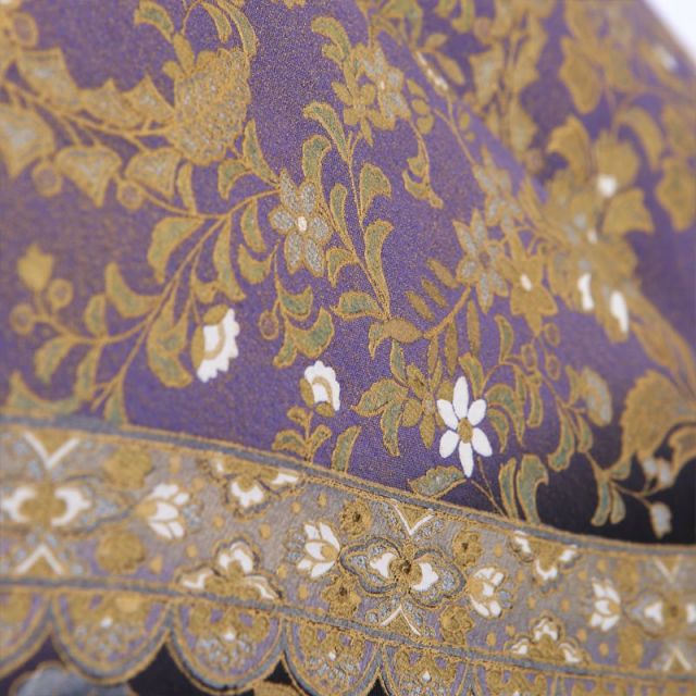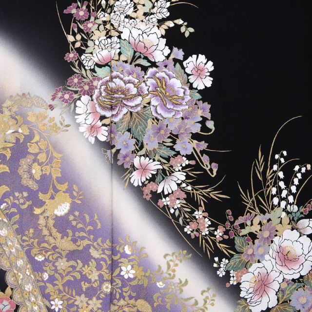 日本を代表するブライダルデザイナーである桂由美が手がける、ゴージャスな中に女性の気品が溢れる1着。紫色のぼかしと豪華な花の共演により華やぎを表現しています。こちらの黒留袖の一番の魅力は中心に描かれた「薔薇」。ラメのピンクで施された刺繍が動くたびキラキラして着物をさらに美しく表現します。「薔薇」は日本古来の植物ではありませんが、西洋では愛する人を象徴する花として親しまれれきました。日本に伝来してからも、その愛らしさから着物の柄として使われるようになり、現代では人気の文様の一つです。またその周りにも紫を基調として様々な草花を描き、特にゴールドで描かれた花唐草文様は、唐草が持つ根を張って広がるという繁栄の意味を表現し、より全体を華やかに仕上げてくれています。対して、斜めに描かれたレースのような文様は伝統文様とは一味違ったモダンの美しさを演出しています。クラシックとモダンを見事に融合させたまさに華やかさを全体で感じさせる1着。こちらは夏向けの単衣仕立てとなっております。6?9月の着用に向いています。