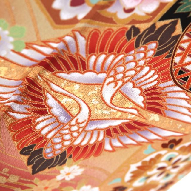 全体に優しい色味で、柔らかく温かい印象を与える1着ですが、使われる文様は伝統的なものばかり。おめでたい文様の代表格とも言える「鶴」は「鶴は千年」と言われるほど健康長寿を意味し、昔の人は繊細で力強い飛び姿に幸せを重ねていました。こちらの文様は「向かい鶴紋」と呼ばれ、一度パートナーとなった相手と一生を共に過ごす「鶴」が、寄り添いながら生きていく姿を文様で表しているんです。また竹の籠に草花を盛った「花籠」が着物全体を可愛らしく仕上げてくれています。おめでたい意味のある草花が豪華に飾られていることから、縁起の良い文様です。中心に大輪で柔らかに咲く「牡丹」は女性の気品を意味し、「菊」は厄を払うという意味があります。また寒い冬の間に美しい花を咲かせる「梅」は気高い姿に気品や忍耐の意味を重ねて、おめでたい文様としてきました。こちらのお着物の特徴は6月?9月に着用するとベストな単衣の着物であるという点。裏地がなく、長襦袢も夏用のものをセットにしますので、涼しく過ごすことができます。表の生地は通常の着物となんら変わりませんので、写真うつりに影響することもなく、季節に合わせた1着です。慶事にぴったりの縁起の良い文様たっぷりの豪華な1着です。