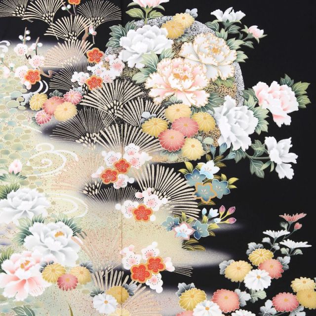 小石が敷かれた小川から澄んだ水が穏やかに流れ、草花が咲き誇る。まるで庭園の景色を爽やかに描いたような素敵な黒留袖。「流水」はその絶え間無く流れ続ける姿から、永遠に続く人生への願いを表しています。金色で全体に散らされた「松葉」は大きく開いた姿が魅力的。「松」は繁栄を意味し、お祝いの席の着物にぴったりです。そのほかにも大輪の姿が魅力的な「牡丹」、おめでたい「梅」、厄を払う「菊」、秋を表す「桔梗」など四季を通じて咲く草花が着物を彩っています。またこちらの黒留袖は単衣という6?9月に着用が向いている夏物の着物です。暑い時期に着物を着ることを不安に思う方もいるかもしれませんが、単衣であれば裏地がなく、セットの長襦袢も夏物。季節に合ったスタイルで快適に過ごすことができます。穏やかで優しい雰囲気をお楽しみいただける1着です。