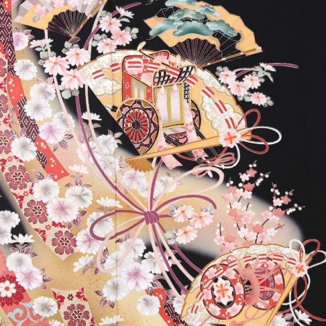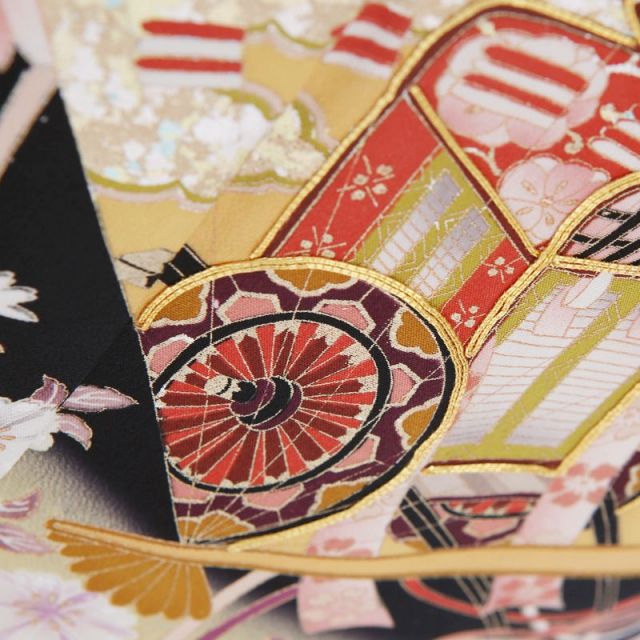クラシックな雰囲気の中でまず目に留まるのが「扇面」と「御所車」。どちらも平安貴族の気高さの象徴とされる格調高い文様です。「扇面」は貴族が常に身につけていた必需品で、「御所車」は貴族が出かけるときに乗った牛車であり、なくてはならない存在でした。現代でも雅の象徴として着物に描かれます。「松」も貴族の繁栄を表すように着物を彩り、雅楽で使われる「小鼓」、日本人が大好きな「桜」など古くから縁起が良い意味を持つとして大切にされてきた文様が全体を華やかに仕上げます。またこちらの黒留袖の特徴は文様だけではありません。6?9月の蒸し暑くなってくる時期にぴったりの単衣仕立てとなっております。裏地がない単衣着物に夏用の涼しい長襦袢をセットにしておりますが、半衿は通年使えるものを使用しておりますので、写真うつりやぱっと見た姿では単衣かどうか分かりにくいです。季節に合わせたお着物を選ぶこととで快適に過ごすことができます。文様と合わせて着用時期も念頭においてお着物を選ばれてはいかがでしょうか。