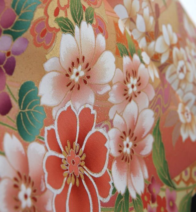 百花繚乱という言葉がぴったりの、美しい花々が咲き誇る姿が魅力のこちらのお着物。「牡丹」「桜」「菊」「紫陽花」などの古くから日本人が慣れ親しんできた花々に加え、古典的なモチーフを使って、まさに幸せを表現しています。金糸の豪華な刺繍が施された「華文」は、元々シルクロードの影響を受けた正倉院貯蔵の宝物に描かれていました。様々な花を組み合わせたシンボル的な格調高い文様です。円の周りが欠けたような「雪輪」は牡丹雪を文様化したもので、雪が降るとその年は豊作になると信じられていたので、吉祥の意味を持つようになりました。扇の「地紙」には円が重なる「七宝」文様が描かれ、途切れないことから永遠を意味しています。「地紙」自体もその雅やかな形と、貴族の繁栄を象徴する扇の一部ということで優美な世界を表しています。花々の下に描かれた風になびくリボンのような文様は「熨斗」といいます。現代ではお祝いなどの進物に添えられる「熨斗」はかつては神事の際に奉納するもので、延寿の意味を持っていました。その伸びやかな姿が優雅でお着物全体に優しい雰囲気を醸し出してくれいます。おめでたい文様と花々の可愛らしさがお祝いの席にぴったりです。こちらのお着物は単衣仕立てとなっていますので、6?9月の着用に向いています。
