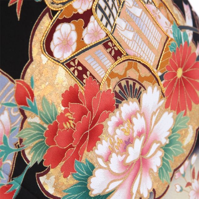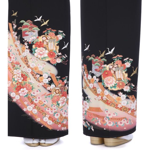 平安時代の貴族といえば、現代でも王朝の豊かな文化や優美な生活を象徴するイメージがありますよね。こちらのお着物ではまさにその世界観を美しい庭園のように表現しています。空高く飛び立つ「鶴」は、鶴は千年と言われるほど長寿の象徴として知られ、その羽を広げた飛び姿は吉祥を意味するとされてきました。貴族の乗り物であった「御所車」や雅楽で使われた「小鼓」は雅やかな生活の象徴として気品を意味する文様です。可愛らしい八重桜の文様と金糸の刺繍をつかった豪華な縁取りが目を引きます。全体には花々が描かれていますが、どれも古典的なものばかり。女性の気品を象徴す大輪の「牡丹」、華やかな「八重桜」、邪気を払う「菊」が赤やピンクなど可愛らしい色味で、おめでたい席を優しく華やかにします。それぞれ華やかな文様が描かれた細長い帯は「熨斗」と呼ばれ、古くは神事にも使われた吉祥を意味し、全体に風が吹いた様な穏やかな雰囲気をプラスしてくれています。単衣仕立てのこちらの黒留袖は6?9月の着用がピッタリ。裏地がなく、長襦袢も夏物をセットし、通常のお着物より涼しいので、暑い時期に着物を着る不安を持たれている方にも安心してご着用いただけます。