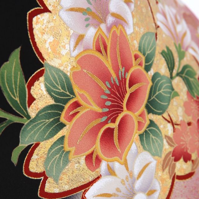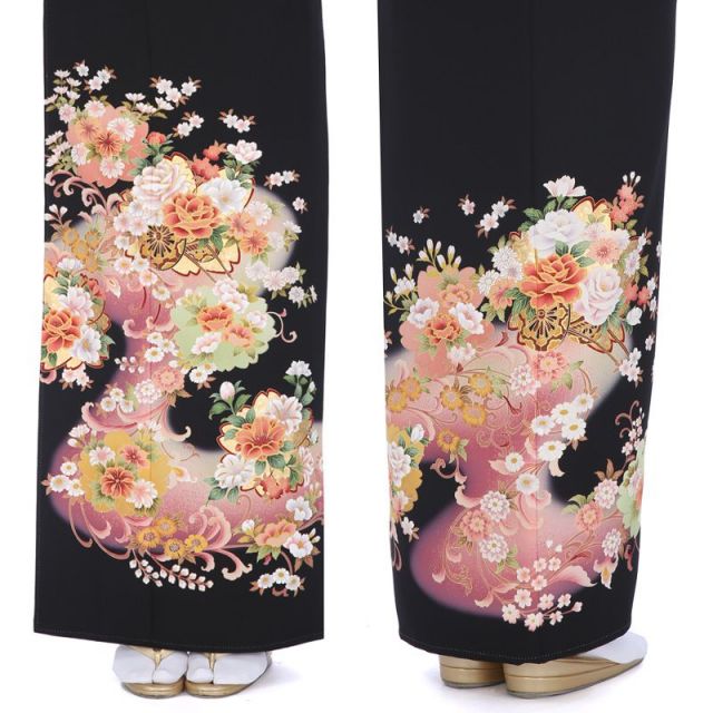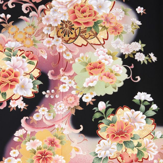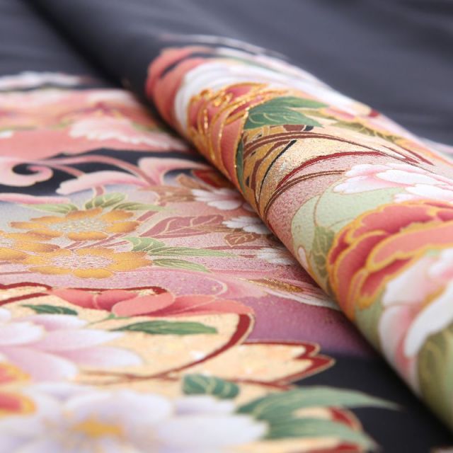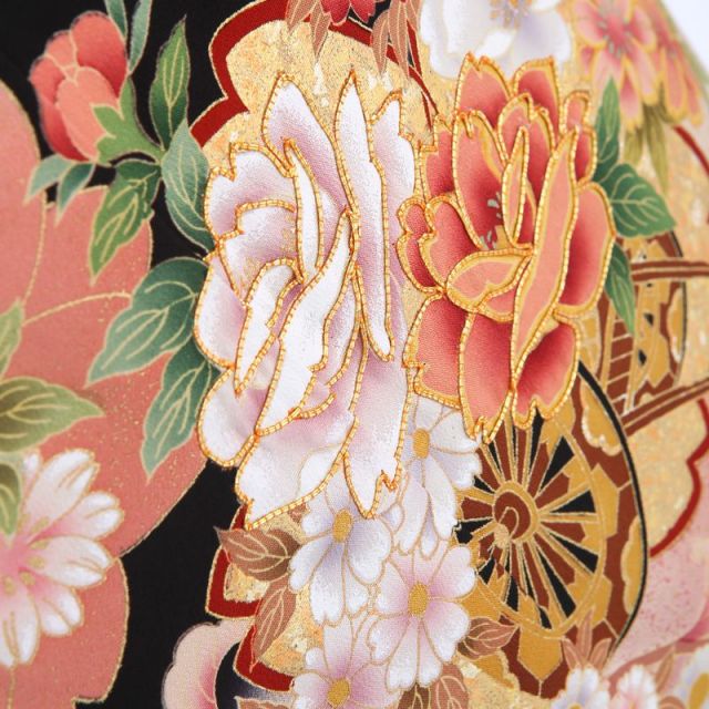 優しく穏やかな雰囲気が魅力のこちらの黒留袖。桜の形をした紋「桜紋」がシルエットとなって着物全体に描かれてます。日本では「桜」は特別な存在です。平安時代から花見をしていたという記録があるほど、その繊細さに魅了され、可愛らしい姿を文様として使ってきました。その上には貴族の象徴である御所車に四季の花を乗せた「花車」にはこぼれ落ちそうなほど沢山の花が乗せられています。「牡丹」や「菊」など古くから日本人がおめでたい意味を込めて文様として使っていたものばかり。非常に華やかです。またこちらの黒留袖は単衣と呼ばれる夏向きの仕立てになっています。暑い時期に着物を着るのはちょっと・・・とお思いの方にも安心して着用していただける裏地のないタイプ。セットになる長襦袢も薄手のものですが、半襟は通年使えるものを合わせますので、通常の袷タイプの着物と見映えはあまり変わらずに、涼しく過ごすことができる1着です。