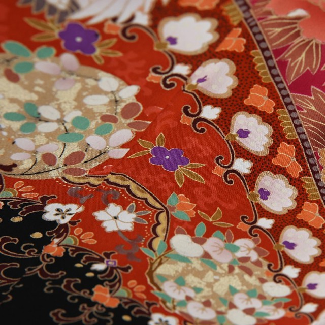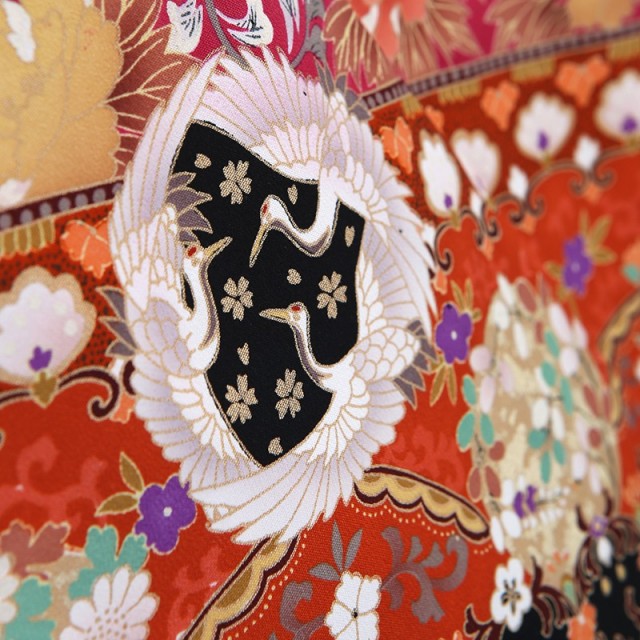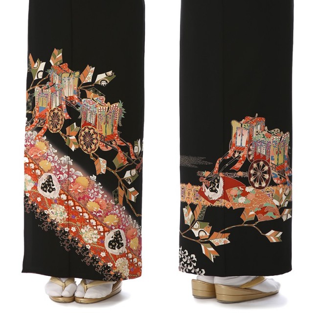 華やかなデザインが目を引くこちらの1着は古典文様を色鮮やかに描いています。「藤」が垂れ下がり、華やかな装飾が施されている「御所車」は、平安時代に貴族が移動手段として使っていた牛車。「藤」が子孫繁栄を表すように、優雅で繁栄に満ちた世界を表しています。また異国情緒も感じられる「唐草文様」も魅力的。西アジアから中国を通って伝来した柄である「唐草文様」は地面を這って伸び広がることから、生命力があるとして繁栄を意味するおめでたい文様です。そんな文様とともに描かれるのが向かい合った鶴を文様化した「向鶴」。その純白ですっとした立ち姿が美しい「鶴」は、おめでたいことが起きる前兆を表す瑞鳥としてと尊ばれてきました。また長生きをする生き物であることから長寿、1羽の相手と生涯をともにすることから夫婦円満を意味します。まさに結婚のお祝いにふさわしい文様です。またこちらの黒留袖は暑い時期にも安心して着用ができる単衣仕立てとなっています。袷の着物よりも涼しい着心地で、快適に過ごすことができます。