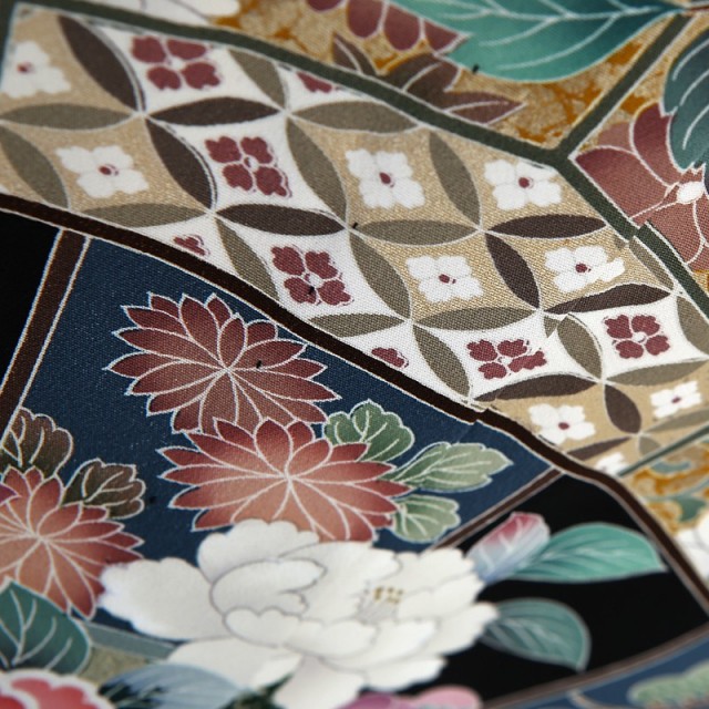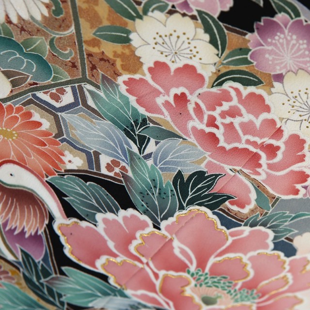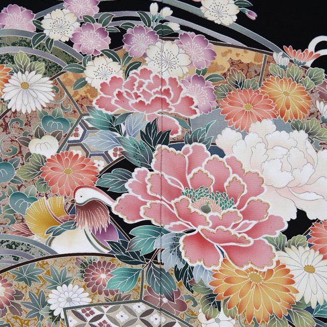 婚礼の席に華を添えるように優しく愛らしい色使いが魅力的です。また描かれる文様も縁起の良いものばかり。波の間から顔をだす2匹の鳥は「おしどり」です。おしどり夫婦という言葉があるように、2羽のオスとメスがいつも行動を共にし寄り添い合う様子は夫婦円満を意味しています。中心には大輪の花を咲かせた「牡丹」が描かれます。理想郷に咲く花と言われている「牡丹」はその姿から富貴や気品を表す文様です。また美しい女性を表す「立てば牡丹、座れば芍薬」という言葉があるほど、古くから愛されています。文様全体を包み込むような「波」は寄せては返し止まることのないことから、永遠の人生を意味する古典文様。「波」のように結婚生活もずっと続いて行きますようにという願いが込められています。婚礼のお祝いの気持ちが文様全体で表現された優しさ溢れる1着です。またこちらの黒留袖は夏用の単衣仕立てとなっています。6月から10月の暑い時期でも、黒留袖の美しさは変わらないままに、涼しく過ごすことができます。