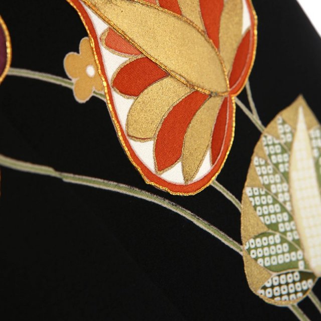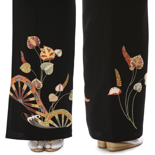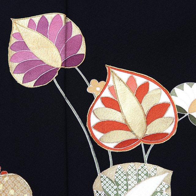黒留袖の黒地の着物にシンプルな「葵」の文様がよくはえます。こちらは「二葉葵」の葉を文様化したものです。葵の茎は地上を這ってひげ根を出し、そこから茎が伸びて長い葉柄の二枚の葉がでるのが特徴でこれを二葉葵と呼びます。京都の賀茂神社の神紋で、神社との縁で徳川家の葵紋となり、着物や帯に広く用いられています。江戸時代には徳川家康が征夷大将軍に着任すると共に葵文は権威のある文様として扱われる様になりました。皆が許された文様ではないので、格調高いものとされています。また「波」の文様は、何度も押し寄せ岩の形や地形をも変えてしまうことから、強い意志を持ち、あきらめず何度でもチャレンジする不撓不屈の精神を願う柄とされています。とらえどころのない自然現象も美化して文様として表現するのは日本ならではでしょう。上品で落ち着いた美しさのこちらの装い、正統派な着物は、大切なお祝いの日におすすめしたい一着です。