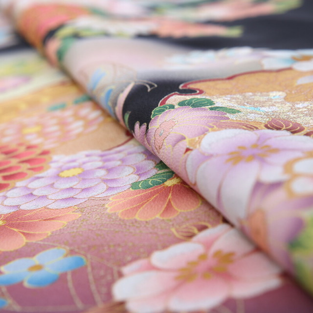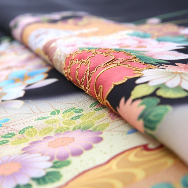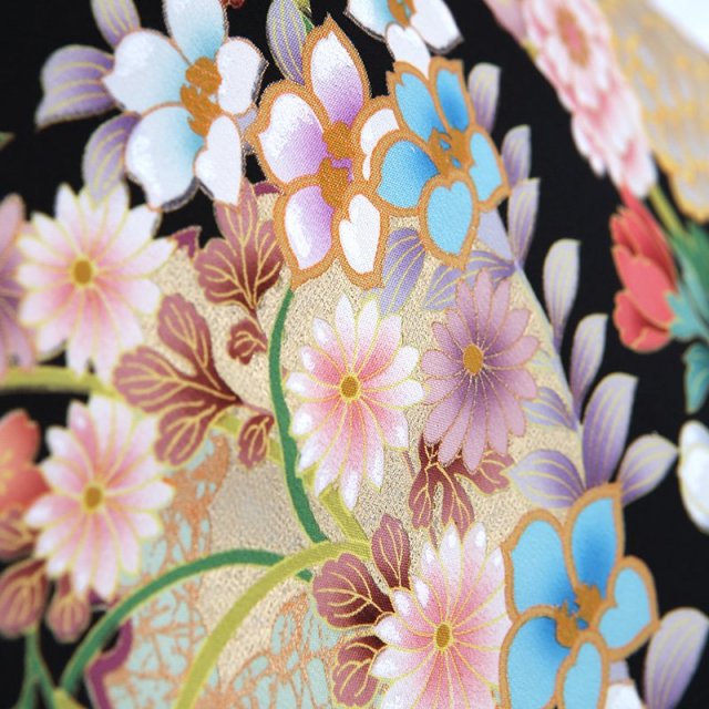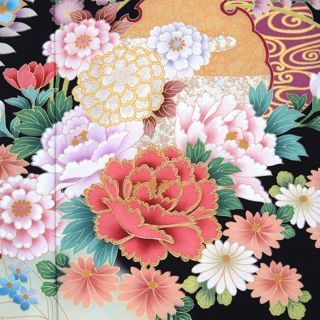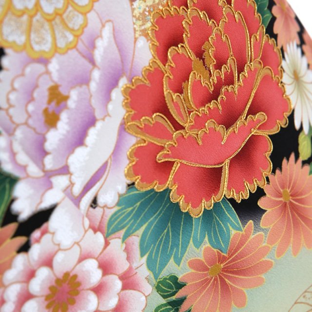 上品で古典的な文様が描かれた黒留袖は、格式のあるホテルや神社など、厳かな雰囲気の会場に相応しい装いと言えるでしょう。「雪輪」は、雪の結晶にみられる六角形を円形にして描いた文様で、平安時代から使われていました。 雪は五穀の精といわれており、その年が豊作になる吉祥の象徴とされています。「霞」は実際には形のないものを描いており、とらえどころのない自然現象を文様化するという日本人の美意識ならではの文様です。そして華やかに描かれる花々。「牡丹」は、姿の美しさと豪華さから「百花の王」とされ、富貴、高貴、幸福を表しています。「菊」は太陽の形に似ていることから、最も位の高い花とされてきました。特別な晴れの日にぴったりな品格のある一着です。