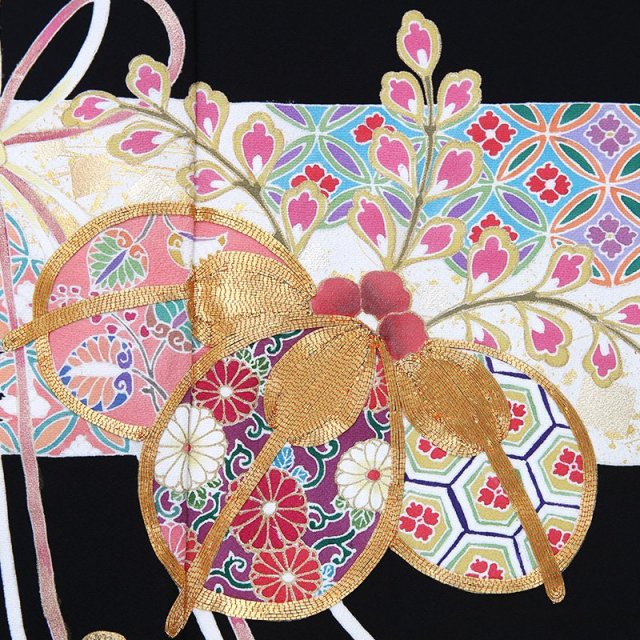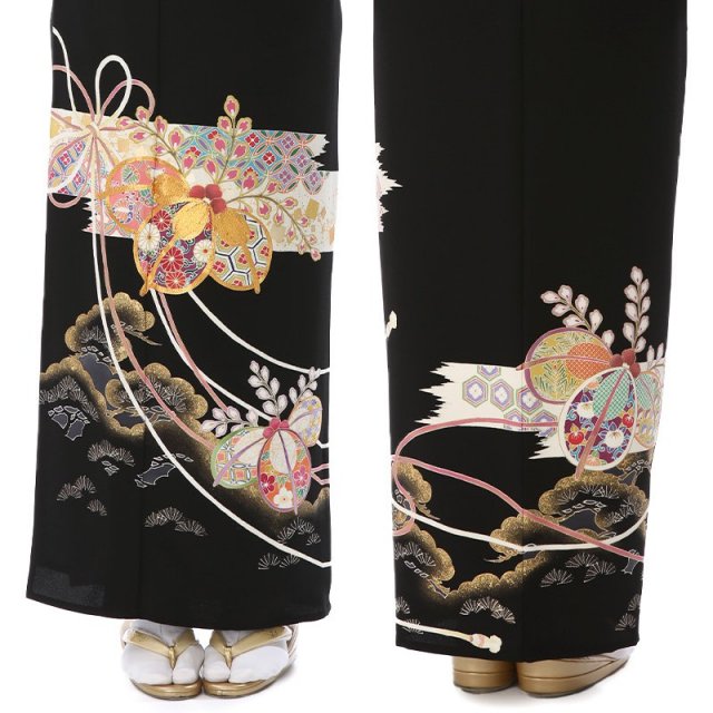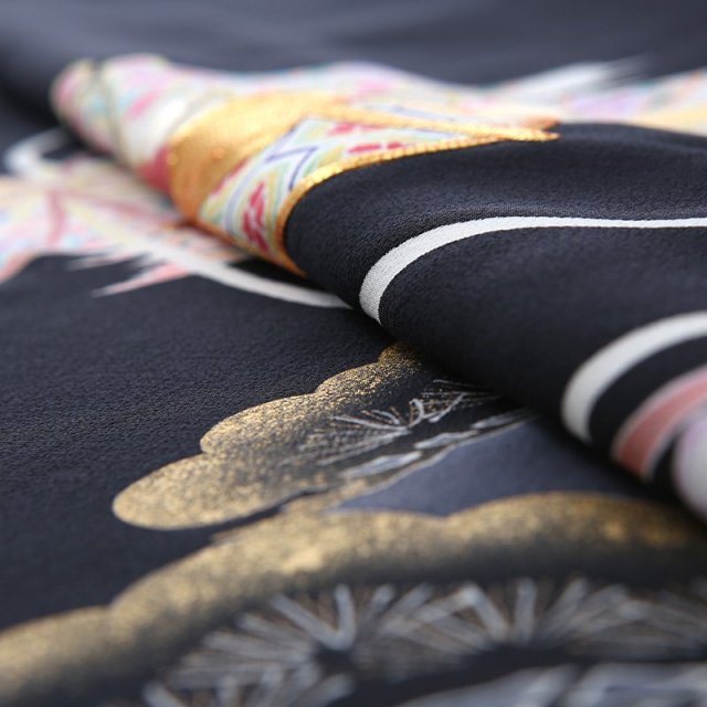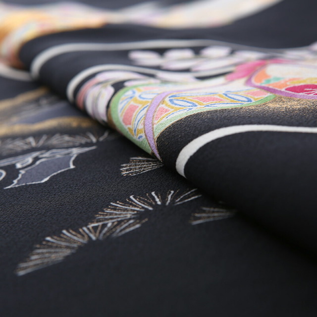 大胆で動きのある文様の描き方は見る人の視線をぐっとひきつけます。シンプルな文様の描き方ですが、さみしくならずに十分華やかに仕上がっています。大きく存在感のある「桐」は、中国で鳳凰が住むとした尊ばれた木です。代表的な吉祥文様の一つで、家紋にも使用され格調の高さを感じます。そして「松」は年中美しい緑を絶やさないことから、逆境に負けない力強さや生命力を表しています。慶事を象徴とするおめでたい文様ばかりで、晴れの日に相応しい黒留袖です。やわらかく浮かび上がるようなデザインは気品溢れる美しさです。身にまとう人はもちろん、見る者の心をも解き放ち、晴れやかにしてくれます。お祝いのシーンに華を添えてくれる一着です。
