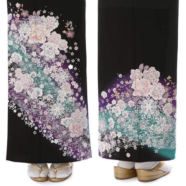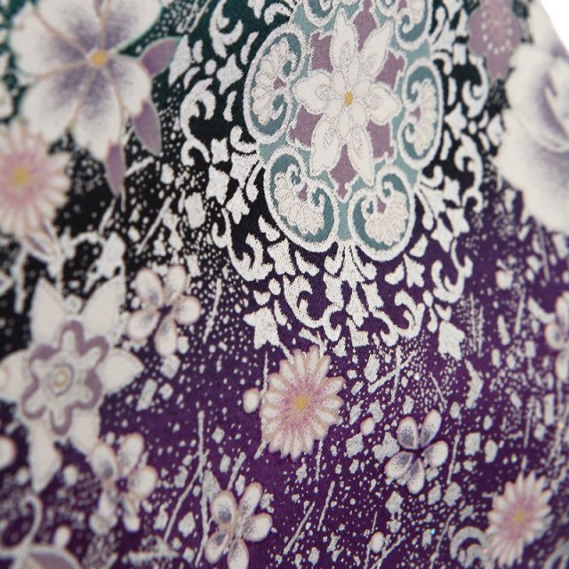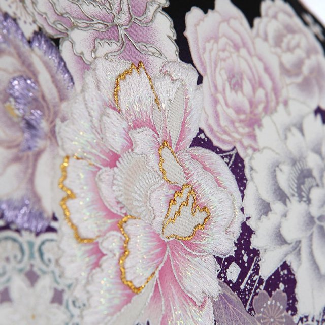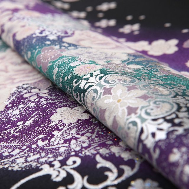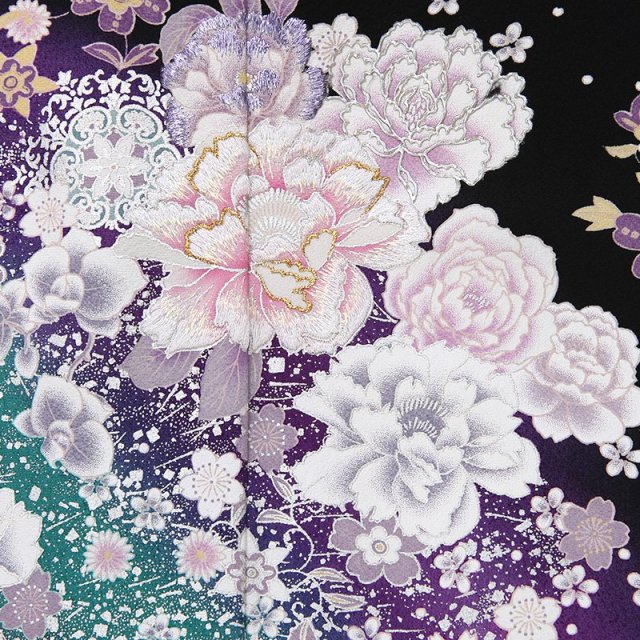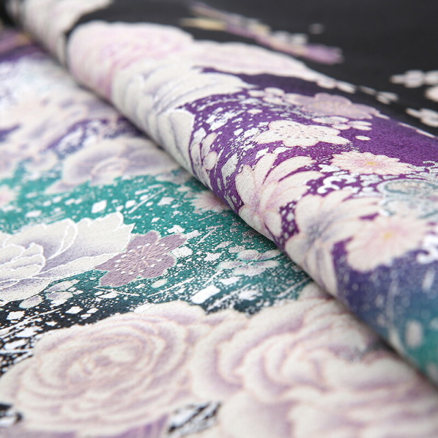 流れるように描かれる文様が非常にエレガントです。大きく描かれる「牡丹」は、姿の美しさと豪華さから「百花の王」とされ、富貴、高貴、幸福を表しています。「宝相華」は想像上の花の文様です。正倉院文様と呼ばれる、奈良時代に東大寺の正倉院に収蔵された、染織品に表されものです。インドや中国から伝わったもので、異国の文化を感じるエキゾチックな雰囲気と格調の高さを感じます。「唐花」も中国から伝えられた文様で、特定の花を指すものではなく抽象的に描かれます。紫と青緑のカラーが非常に美しく、星の空のようにキラキラと輝くデザインに惚れ惚れ。他であまり目にすることがないデザインで、個性的な装いをしていただけます。お祝いの日には自分らしさを感じるお洒落なものを。古典を大切にしながらもモダンな雰囲気もある、存在感がある黒留袖です。