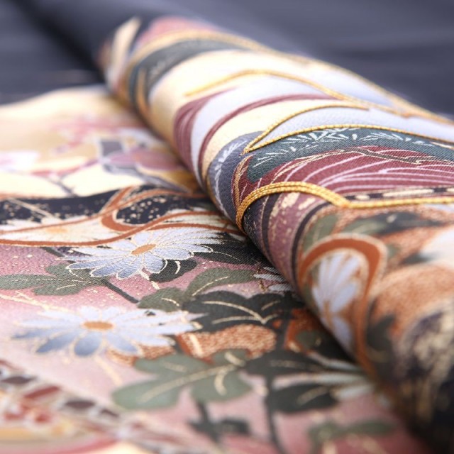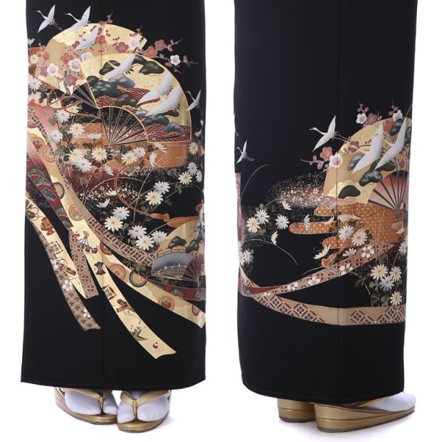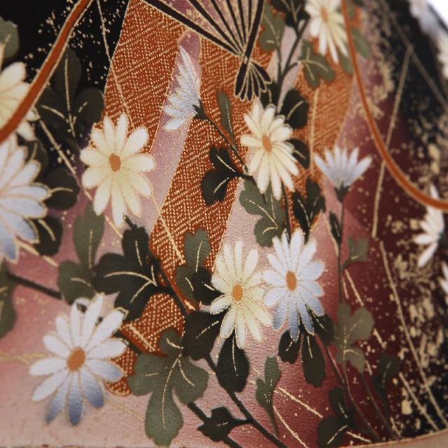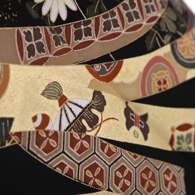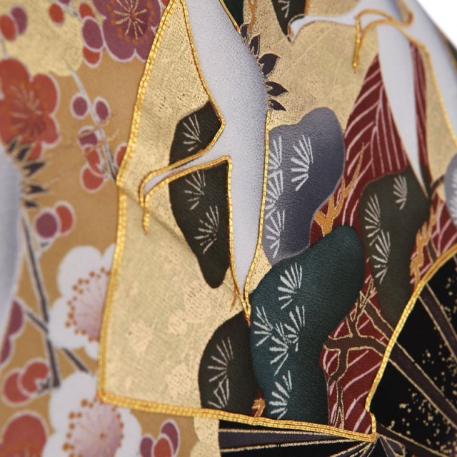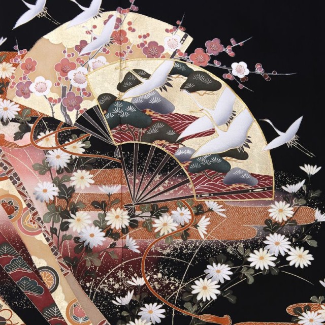 金を華やかに使い、高級感と気品を表現しています。過度に煌びやかにならないところが魅力の1着です。金色の「扇面」の上を優雅に飛び立つのは「鶴」。おめでたい鳥としてよく知られた「鶴」はその純白で美しいシルエットから古くより着物に使われきました。長寿を意味し、お祝い事にはぴったりで素敵な文様です。「扇面」は平安貴族のマストアイテムであったこと、末広がりであることから、雅の象徴として使われる高貴な文様とされています。更にこちらのお着物の「扇面」には繁栄を意味する「松」、強さと気品を象徴する「梅」が描かれていて、その上を鶴が飛ぶデザインはおめでたい席の喜びをいっぱいに表現したカッコいい仕上がりです。その下方に描かれる帯状の「熨斗」は、「長寿」を意味する文様。帯が風になびくような姿は、清涼感を表現してくれています。それぞれの帯に細かな文様が描かれていますが、ここにも小さな工夫がたくさん見受けられます。穏やかな生活を意味する「青海波」、「宝尽くし」と呼ばれる身を守ってくれる宝物、永遠につながる円の中に花が描かれた「花七宝」など幸せな文様が小さな中にたくさん描かれているんです。様々な発見がある格式高いおすすめの1着です。