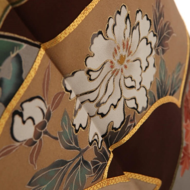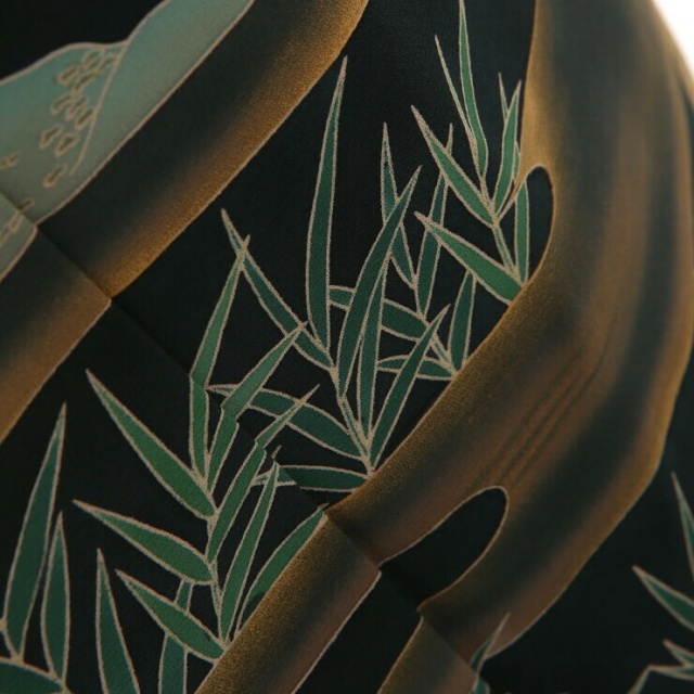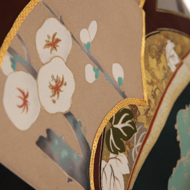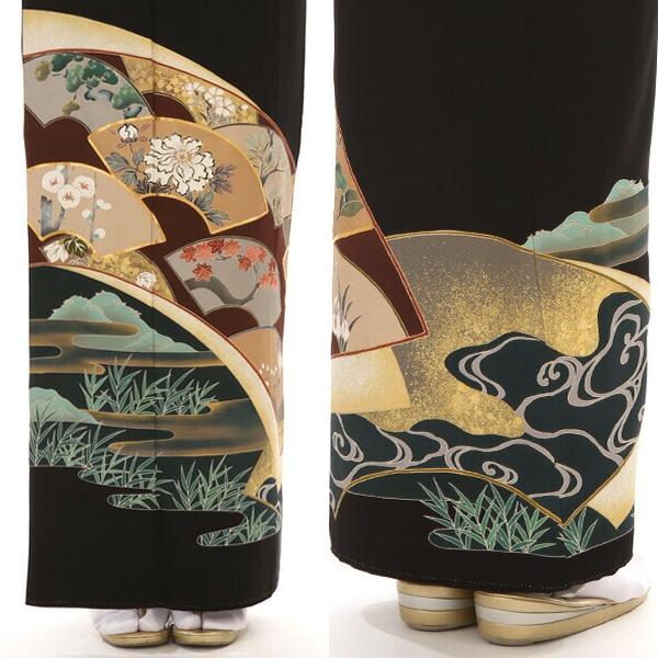 黒留袖と一口に言いましても、文様や色使いによって印象は様々です。こちらのお着物は、華やかと言うよりは、落ち着いた、知的なイメージです。丸くデフォルメされた梅の花や、白牡丹など、一幅の絵画を鑑賞しているような、そんな贅沢さがあります。地紙とは、扇に貼る台紙のこと。扇そのものではなく、一部分をピックアップして文様化するのは、とても興味深いですね。江戸時代の小袖にもよく使われていたみたいで、少しアンティークっぽい雰囲気もあります。地紙には、器物文様や植物がつきもの。こちらのお着物にも、四季の花や植物が描かれています。「松竹梅」「牡丹」「桜」「楓」「葡萄の葉」などなど…特別、季節を限定してはいないので、何月のお式でも大丈夫です。実は、地紙の外側にも大きな地紙。構図が面白いお着物です。ダイナミックな配置と、その後ろのエ霞の雰囲気が非常にマッチして、雄大さを感じさせます。それはある意味、送り出される親御さんの、「私はここで見守っているから、あなたの人生を歩んで行ってね」という心の広さを表すものでもあります。同時に、寂しさをも感じさせる部分もあり、複雑な親心を美しく表現した留袖でもあるのです。