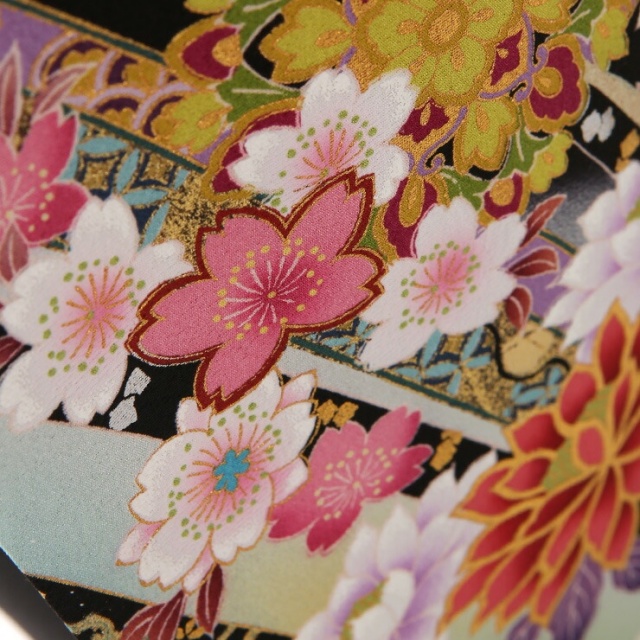 束ね熨斗がたなびく様を背景に、多種多様な桜が描かれた、華やかなデザインです。前身頃から後ろ身頃まで優美なラインで描かれているのは、熨斗を束ねた束ね熨斗です。熨斗は鮑を引き延ばした熨斗鮑に由来することから長寿の意味を持つとして、また、おめでたい席に用いられるものであることから縁起の良い物として、留袖や振袖といったはれの着物に多く描かれてきました。束ね熨斗と同様に背景に配されたぼかしは、柔らかな寒色系の色味で、赤やピンクといった暖色系の桜の花の色合いを際立たせてくれます。そして、大きさ、彩り、描き方を様々に変えて描かれた桜の花は、言わずと知れた日本を代表する花。意匠化された桜のため、季節を問わずお召しいただけます。目立つことなく控えめではありますが、束ね熨斗にもぼかしにも、七宝、亀甲、青海波などの古くからの文様が描かれ、古典的な雰囲気をより一層深めています。束ね熨斗の流れるようなライン、大小様々な桜の花の配置の良さから、小柄な方にもすっきりと着こなしていただけます。柄がたっぷりあり、かつ、小さな柄だけでなく大きな柄も含まれているのにそれらがバランス良く配置されている点で、自信を持ってお薦めできる一着です。日本の花の代表といえる桜をまとった美しい立ち姿、晴れの日に相応しい装いです。