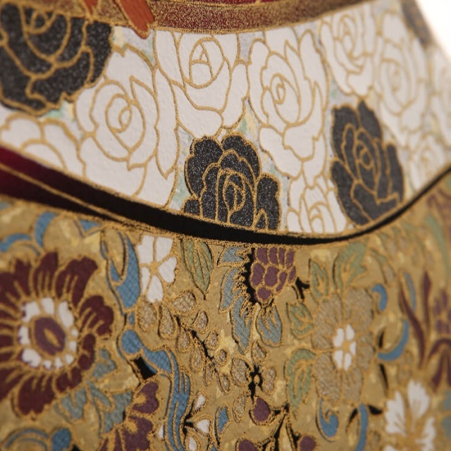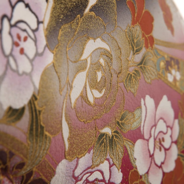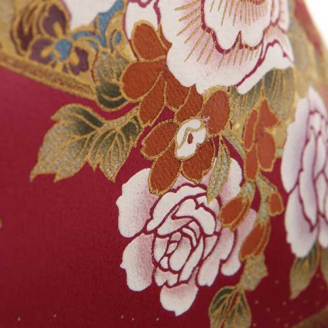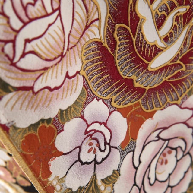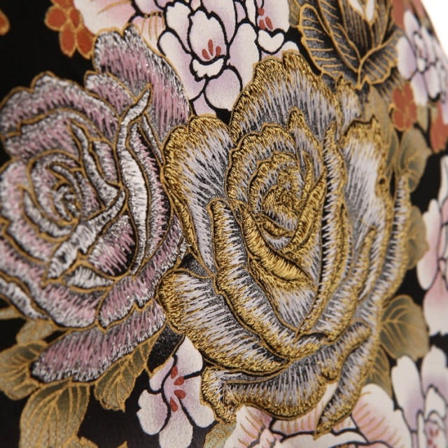 着物の古典的な美しさとモダンなファッションを融合させたデザインが大人気の桂由美。個性的ながら日本らしさを感じさせる黒留袖は高級感を醸し出しています。こちらのお着物の柄でまず目に入るのは、洋花の「薔薇」ではないでしょうか。日本の伝統的な文様ではありませんが、「薔薇」は西洋では愛らしい花として親しまれ、花言葉が愛情であることから、近年ではお祝いの席に合う文様として使われることも多い、人気の柄です。そんな薔薇が和の雰囲気にしっかりとハマっている理由は、豪華な刺繍と金彩。薔薇の花びらにあしらわれた刺繍は、煌びやかに立体化感を表現しています。金色だけでなくピンク・白の糸を使った、ギラギラし過ぎない奥ゆかしい雰囲気が魅力的です。また、細かな柄にまであしらわれた金彩が高級感を出し、着物全体を眩しいほど豪華に仕上げています。