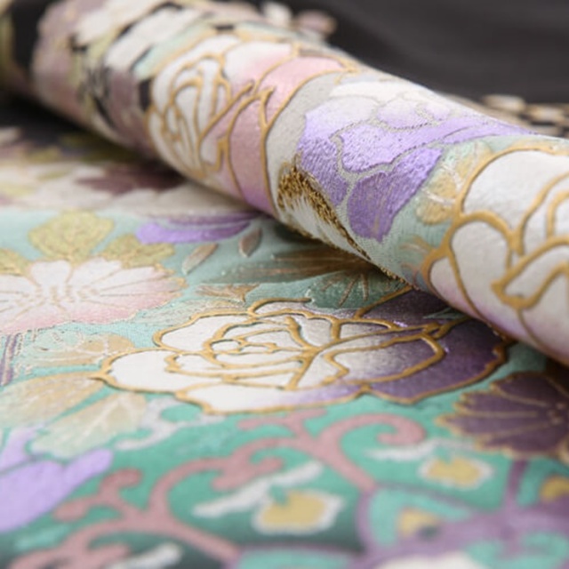 エメラルドグリーンの爽やかな背景に、まさに今花開いたような満開の薔薇が輝いています。日本の伝統的な世界に洋風を融合させたデザインが大人気の桂由美。彼女のジャポニズムの世界を存分に感じられる1着です。古典的な絵柄よりも洋花を使い、現代的なおしゃれ感覚を取り入れながら、お祝いの気持ちを込めた優しい仕上がりになっています。メインの文様である薔薇は、伝統的な着物の文様ではありませんが、西洋では古くから「愛情」を表す花として、愛しい人への思いを込めていたそうです。豪華な薔薇への刺繍と全体にあしらわれた金彩が着物全体を美しく輝かせ、まるで天の川に花々が浮かんでいるような幻想的な雰囲気を醸し出しています。古典柄とは一味違う個性的なお着物ですが、慶事の席にぴったりの豪華な刺繍や金彩にお祝いの気持ちがこもっています。