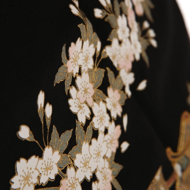 平安貴族の世界を個性的なデザインで見事に演出しているのは、大人気留袖ブランド桂由美。世界にジャポニズムを発信し続けている桂由美が送る、金彩を贅沢に使って平安の雅さを表現した贅沢な黒留袖です。まず目に留まる牛車は「御所車」と呼ばれる文様で、平安貴族が移動手段として使っていました。貴族の優雅さ・高貴さを表す文様として着物に使われます。その周りには平安時代の間仕切りであった「几帳」の様な文様が風になびき、雅さを感じさせています。その周りに描かれた「桜」は古くから日本人にとって馴染み深く、「新しい始まり」を感じさせる大切なお花です。未来への展望を意味することから、春だけでなく四季を通して着用することができます。雅さを感じさせるのはこれらの文様だけでなく、豪華に文様を彩る金箔と金箔の存在があります。金色はお祝いの席には欠かせない色で、お祝いの気持ちを表現してくれます。平安貴族と夜桜、そして豪華な金。まさに源氏物語のような世界を表現していますね。現代と変わらず、平安貴族も桜に人生を重ね、見上げていたのではないでしょうか。