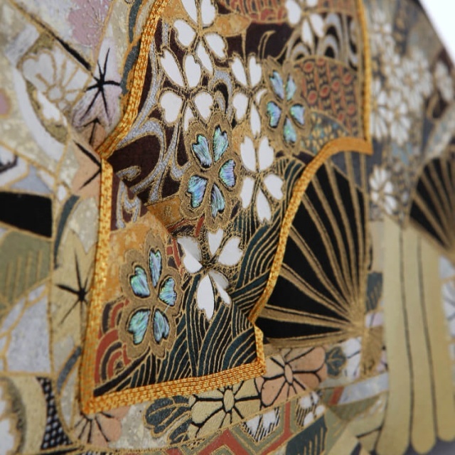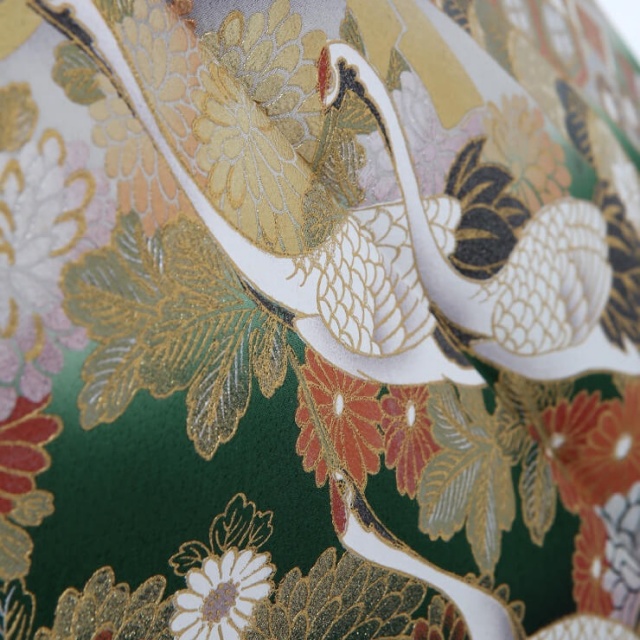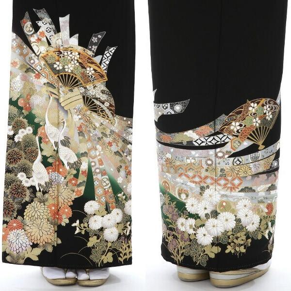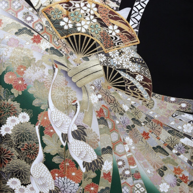 新潟県十日町にある有名な友禅の老舗『関芳』の留袖ブランド『ことほぎ』の黒留袖です。ダイナミックな束ね熨斗と金駒刺繍で縁取りした立体的で豪華な扇が目を惹きます。派手で目立つかもと思いきやお着物全体の彩度が高すぎないこと、そして緑を基調に柔らかい色合いで描かれているので、上品な美しさが際立っています。熨斗は元々、神事に欠かせない熨斗あわびがルーツ。熨斗はやがて進物や贈答品に添える飾りとして慶事の時にはなくてはならないものになりました。熨斗紋は大変おめでたい文様として人気の高い柄です。熨斗が帯状に広がり、1つ1つに縁起のよい吉祥文様や高貴な有職文様などの伝統文様があしらわれています。お着物の前から後ろへ優雅になびいているさまには気品を感じさせます。扇は末広がりの形から、運が開ける意味を持つと同時に、神を仰ぎ寄せることから厄除けの意味もある縁起の良い文様。まさに門出の日に相応しい願いが込められています。裾線にかけては、色とりどりの菊をはじめとする草花が描かれ、鶴が端整な姿で降り立っています。鶴は不老長寿を願う格の高い吉祥文様。またしなやかな姿や美しい白い羽毛から、美の憧れでもあり、お着物に風格と麗しい印象を与えています。華麗でありながら、とても品良く映るこちらの黒留袖は、晴れの席で優美な身のこなしにしてくれます。