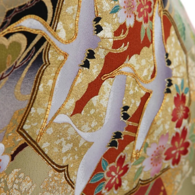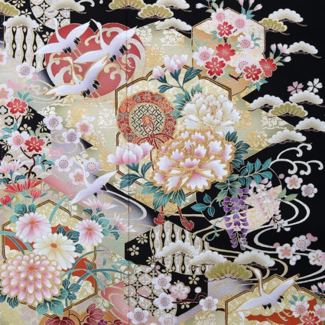 贅沢なまでにおめでたい絵柄をふんだんにあしらった徳川の美の留袖。金箔や刺繍を使用し日本伝統の美を現代風にアレンジしております。おめでたい柄の代表的な鶴文様はもちろん長寿を願う絵柄です。それに伴って松も常盤木と言って葉の色が変わらぬことから不変性を意味し、長い生きの象徴であります。鏡を絵柄にした鏡裏紋(きょうりもん)と言う文様がありますが、古鏡(こきょう)と言う古い鏡の裏側を、鏡そのものを生かし金、銀、螺細で豪華に装飾、鏡と紐(ひも)を図案化し文様化したものです。「古鏡」は人類生命の歴史を反映した脳(仏性)の働きを古い鏡に例えたものであり、古は古今を意味し、永遠を意味。鏡は外界の事物を映し出す道具でもあり、祖仏が具有する無分別智の象徴とされていました。古い生命が進化の歴史を持つ脳とその認識機能=古鏡とされてきました。中国では「神霊視」悪鬼を駆除し災いを回避、除災の祭具とされてきました。鏡にも深い意味があるのがよくわかります。ほかにもおめでたい絵柄が沢山あります。艶やかな牡丹は「富貴」「高貴」「壮麗」の意味があり、流水紋の波は命の源である聖なるもの、ブドウは多くの実をつけるため豊穣の象徴と子孫繁栄の意味をなしています。
