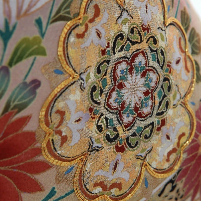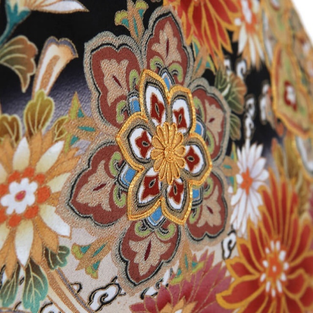 留袖にひときわ大きく描かれている「宝相華紋」は、正倉院文様を代表とするモチーフとしてお祝い事には欠かせない文様です。もともとは空想上の花を仏教で「物事が達成する完成された美と善の花」として考えられ用いられてきました。金彩と刺繍によってシンメトリー(上下左右対称)に描かれた図柄が完全な形であることからそう名つけられたのでしょうね。天皇家の紋「菊の御紋」として有名な「十六八重表菊」の元となった「菊の花」は、「長寿」の国日本を象徴する「国花」です。古来中国では、「不老不死の妙薬の謂れ(いわれ)」があり、お酒に菊の花を浮かべて飲んだとされています。そのため「無病息災」「延命長寿」「邪気祓い」の薬効として大切にされています。もちろん日本でも「高貴」「高尚」などの意味があり。日本のパスポートには「十六一重表菊の文様」が刻印されていますね。菊の絵柄の下に流れる「流水」は、「水が流れて決して腐らず、命の源」とされています。また「清廉」や「正義」などの意味も持ち、「火除け」のお守りの意味合いもあります。
