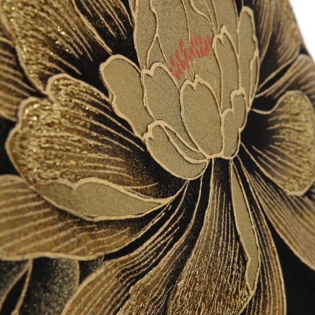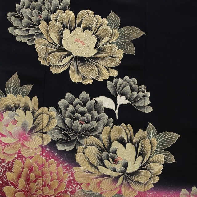 牡丹というオーセンティックな伝統柄を大胆に配置しながらも現代的な印象を作り出す、桂由美ならではのデザイン力が活きた黒留袖です。漆黒の地色に大輪の牡丹が浮かび上がり、幻想的な雰囲気が漂います。金彩画法で金花銀花に描き分けられた牡丹の花は、富貴の象徴。牡丹の花びらには、さらに熟練の職人によって刺繍がほどこされ、ゴージャス感がいやがうえにも高まります。大輪の牡丹尽くしの文様は「富貴尽くし」といえるほど、縁起の良い柄です。この黒留袖のネーミングは「花光る」。そのネーミングのように、百花の王とも讃えられる牡丹から気品が煌めく光となって降り注ぐかのようです。金箔は、裾に配された渋みのある赤いラインにもふんだんに散りばめられています。けれどもデコラティブになりすぎない、ある種の抑制が独特の風格を生み出しているのは、和と洋の融合が見事になされているせいでしょうか。ドレス感覚で着こなせる黒留袖でありながら、風格をも兼ね備えた一枚をお探しの大人女性に選んでいただきたい一枚です。