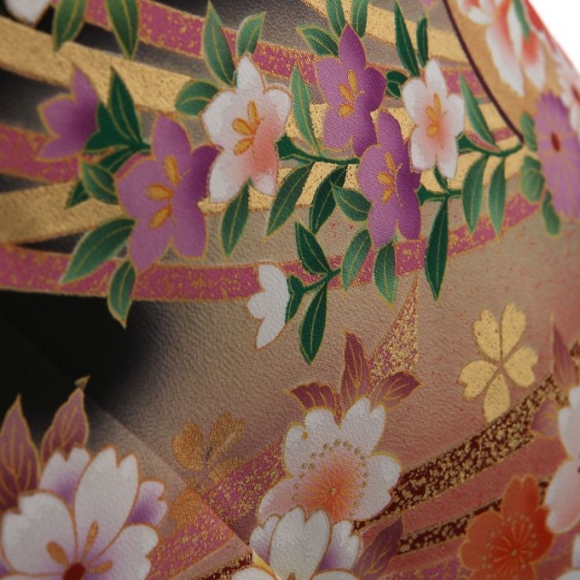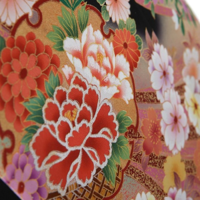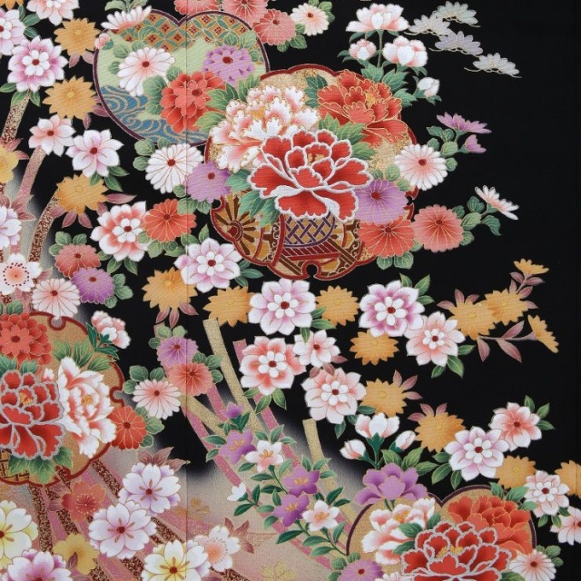 団扇や雪輪の文様の中に、色とりどりの花や、花車が描かれ、とても華麗なおキモノとなっております。「団扇(うちわ)」は災いを退けるという意味を持つ、古典的な吉祥文様です。ハートの形に似ていることから、かわいらしさも生み出しています。また、「雪輪」は雪の結晶から文様化されたものです。はかなさと繊細さを持ち、夏には清涼感があるとしても人気があり、一年を通してお召しいただける文様です。百花王とよばれる「牡丹(ぼたん)」が、ぽってりと艶やかに花車に描かれ、長寿を象徴する「菊」、繁栄を意味する「桜」などとともに、さまざまな花がそれぞれ咲きほこるように描かれていて、まるで花畑にいるような夢見心地になるおキモノです。 背景に束ねられた熨斗(のし)が舞い、さらに華やかさを加えるとともに、風を感じる軽やかさもある絵柄になっております。この「熨斗」は、永続や喜びを表す文様として、晴れの日のおキモノには人気の柄です。花ぞれぞれが、絶妙な大きさで描かれているので、これだけたくさんの花が描かれているのに、重たさを感じさせませんから、どのような体形の方でも、ステキに着こなしていただけます。