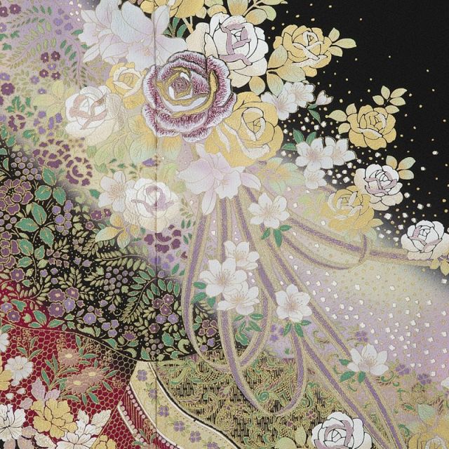 「日本の美を世界に発信する使命」を胸に友禅や博多織など数々のコレクションを発表してきた桂由美ブランド。本物のエレガンスを身にまとえる留袖になっています。中央に描かれているバラの花束は、本来薬玉と言われる日本古来より使用されてきた絵柄を洋花の“バラ”と“カサブランカ”を使用しアレンジさせたもの。薬玉に使われていた薬草は本来“菖蒲”や“蓮の葉”を編んで球を作り、5色の糸を通して花を飾りました。現在では四季折々の季節を問わない花を使用するようになり、薬草や香草をいれて香りもプラスしています。そんな薬玉を“バラ”や“カサブランカ”を使いデザインした絵柄は、桂由美ならではの「和と洋を融合させた」大胆な発想です。背景の細かい草花が星屑のようにちりばめられ、まるで宇宙を漂うブーケのようです。赤バラの意味は「愛情」「美」「情熱」「ユリの女王」であるカサブランカは「誇り高き美しさ」「永遠の絆」「結合」を意味し、「愛の花」とも言われています。「母の高貴な美しさ」をも思わせる高級正絹の留袖は、主役にも負けないほどの存在感を感じさせてくれることでしょう。