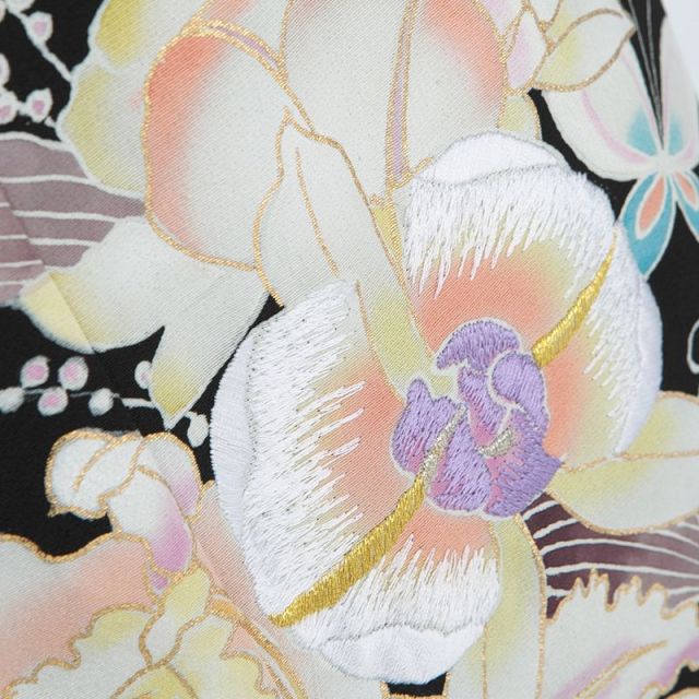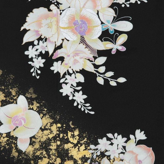 蘭の一種で洋ランの女王と言われるカトレア、華麗に咲き誇り成熟した大人の魅力や貴婦人のように美しく、円熟した大人の魅力や格調高さをエレガンスに表現しています。ともに描かれている胡蝶蘭は、花弁が蝶に似ていることから、蝶のようにひらひらと「幸運が飛んでくる」、共にする喜び幸運がとんでくるとされていました。蘭は子孫繁栄と結びつけられており、繁栄のシンボルでもあり安定をもたらすとも言われています。上品で高貴な姿は愛と美の象徴としてふさわしいですね。正式な学名は「ファレノプレス・アフロディーテ」と言い、愛と美の女神アフロディーテからきているそう。昔のヴィクトリア時代の英国では、あまりおめにかかれない美しい女性に例えられていたようです。蘭は左右対称の美しい花を咲かせることから「完全なる美」も表しています。「幸運が飛来し、それが安定し長く続くように」の願いを込めたのでしょう。平安時代の公家装束の有職文様に取り入れられ独立した文様として人気の蝶文様。形が美しく色も美しい、羽に大胆に文様や曲線を描いたものを胡蝶と言い蝶の別称のようです。宮崎玄祥はこれらの蘭や蝶を組み合わせ友禅に優雅に表現いたしました。まるでブーケのようで、その周りを蝶が幸せをたたえ舞っているようですね。