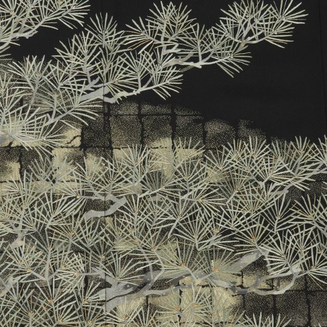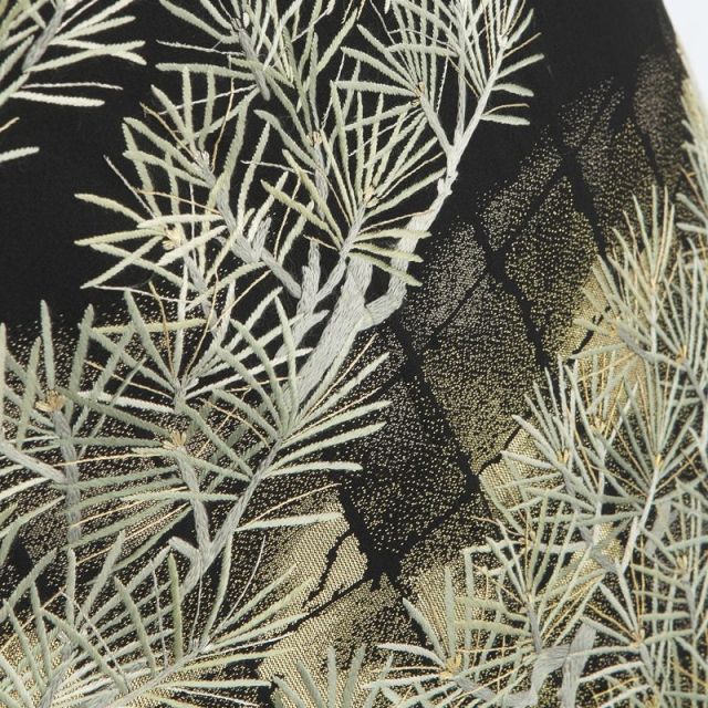 数ある西陣織物ブランドの中でも、トップクラスの「山口美術織物」。美術性の高い帯などで知られています。歴史ある帯の機屋さんなので、技術の確かさは折り紙付き。皇室御用達であることはよく知られるところです。TVドラマへの衣装提供なども、積極的にされています。各所からの信頼がある、まさに「ブランド」です。そんな山口美術織物が手がける黒留袖です。繊細な刺繍で表現された松枝。奥行きと立体感のある構図で、その枝ぶりは見事に表現されています。絵画的な美しさも、持ち合わせています。松は、おめでたいものの代表格として、今や知らない人はいないといっても過言ではないかもしれません。寒い冬においても、青々とした緑を失わない。その姿に、人々は生命力や霊力を見出し、昔から大切にされてきました。神様が地上に降り立つときに、老松を経由する、との逸話もあったりしますから、心を込めて願ったことが天に通じるような気持にさえなります。オーソドックス、と言ってしまえばそうかもしれませんが、非常に歴史のある受け継がれた文様ですから、着る人の願いを受け止めて成就させる力も、一層強いとも言えるでしょう。黒留袖らしく、品よくエレガントに。山口美術織物の歴史を折り込んだ、シンプルで飽きの来ないデザインです。
