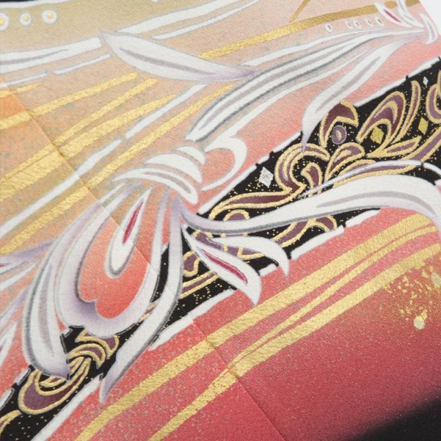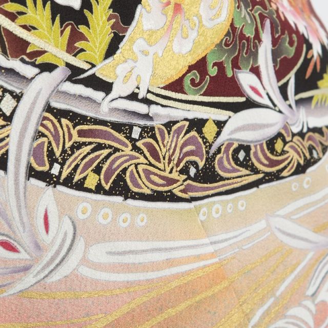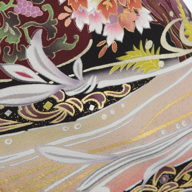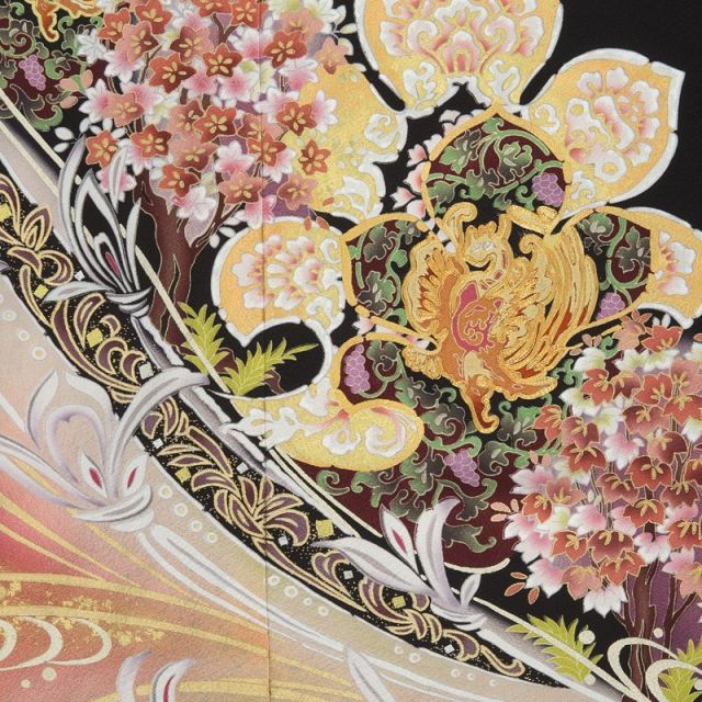 古代中国の伝説上の生き物、鳳凰がモチーフになっています。鳳凰は鳳が雄、凰が雌を表します。鳳凰の羽は5色に彩られていて、長い尾を持つと考えられています。鶴と同じようにおめでたい鳥、瑞鳥とされていて、日本に伝わってきてからはおめでたいモチーフのひとつとしてお着物にも使われてきました。留袖の柄の上の方には2羽の鳳凰描かれていますが、長い尾をなびかせて飛ぶ姿は優雅さと品を感じさせます。留袖の柄の左の端や中央にはゴールドに縁どられた姿もあり、とても豪華です。鳳凰まわりはぶどうのつると果実、白や赤の花をつけた木などが印象的に描かれています。裾の方には、流れる水のような模様など動きのある柄がデザインされています。同じデザインで色ちがいの黒留袖もありますが、こちらは裾まわりが暖色系に色付けされているので、華やかで明るい印象になります。
