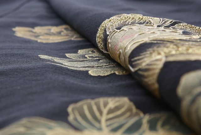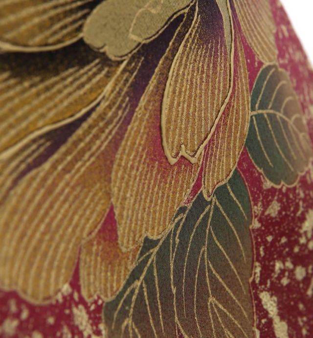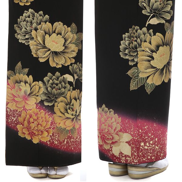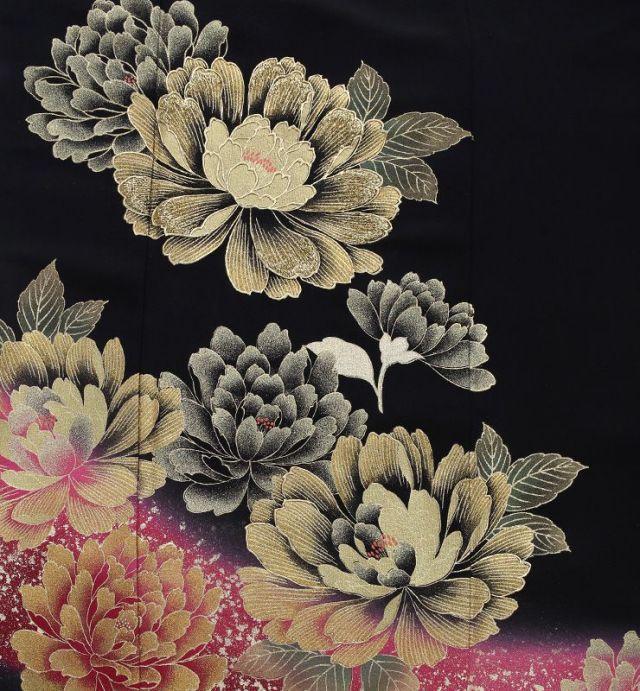 ひと目見てほかの黒留袖とはちがうと思わせる印象的な1枚。透け感のあるデザインがとても斬新で目を引きます。洋装のような華やかさとテイストを和装の黒留袖にマッチするように表現できるのは桂由美ならでは。モチーフはひとつだけですが、黒に金や銀の花がよく映えて、とても美しい黒留袖です。こちらは金彩(きんだみ)という技法で描き上げられています。金彩技法とは、金や銀などの箔や粉を生地に接着させる技法のことで、金加工とも呼ばれます。花びらの縁取りやグラデーションなどが金彩で表現されていますが、とても美しくあでやかになっています。また、金彩加工だけでなく、金や銀の糸で刺繍もほどこされているので、より豪華なものに仕上げられています。熟練の職人の手によって緻密に丁寧に作られた桂由美の逸品です。