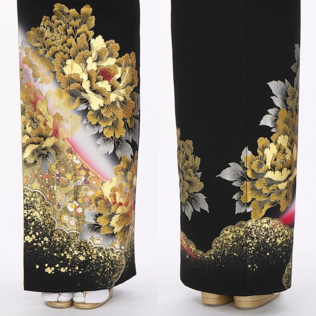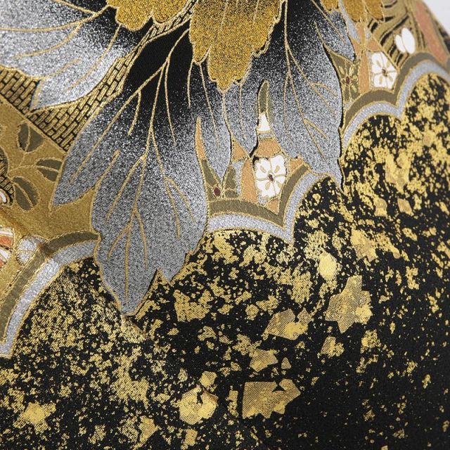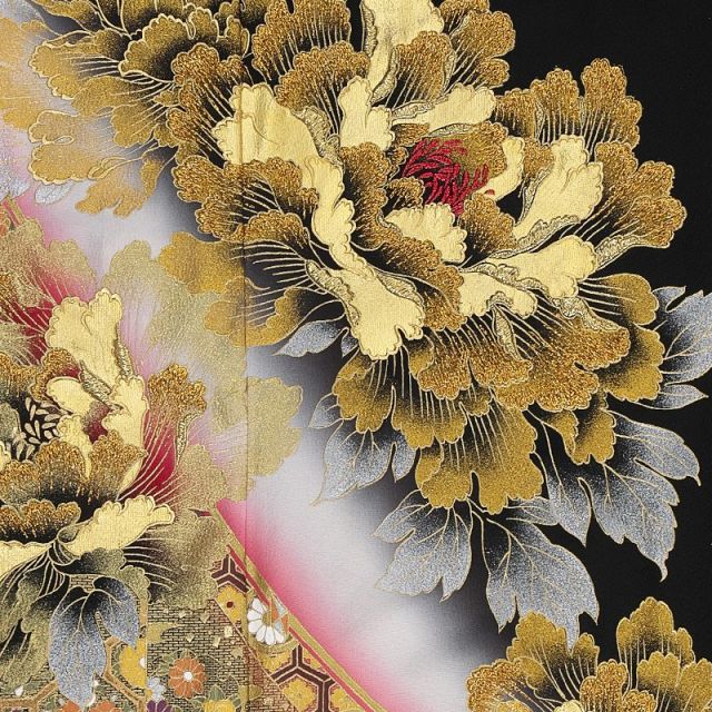 大輪のぼたんの花と輝くゴールドが目を引く黒留袖。大胆な構図と現代的で斬新なデザインが見る人を引き付けます。ただ斬新なだけではなく、亀甲文様や松など日本の伝統的な柄とも融合させているのが桂由美の黒留袖の魅力です。真ん中より少し下のところにはおめでたい柄とされる吉祥文様の松、雪輪に菊と橘、六角形の形をした亀甲文様、円が重なっている七宝など、古くからお着物の柄として愛されてきた伝統的な柄がデザインされています。どちらかというと落ち着いた色あいで色付けされていますが、まわりが金彩(きんだみ)で装飾されているので、とても華やかです。金彩というのは、金や銀の粉や箔をつける技法のことで、裾の金がちりばめられているころやぼたんの花にも使われています。ぼたんの花びらには金の糸で細かな刺繍もほどこされています。金彩の豪華さに加え、緻密で丁寧な刺繍があでやかな美しさを作り上げています。