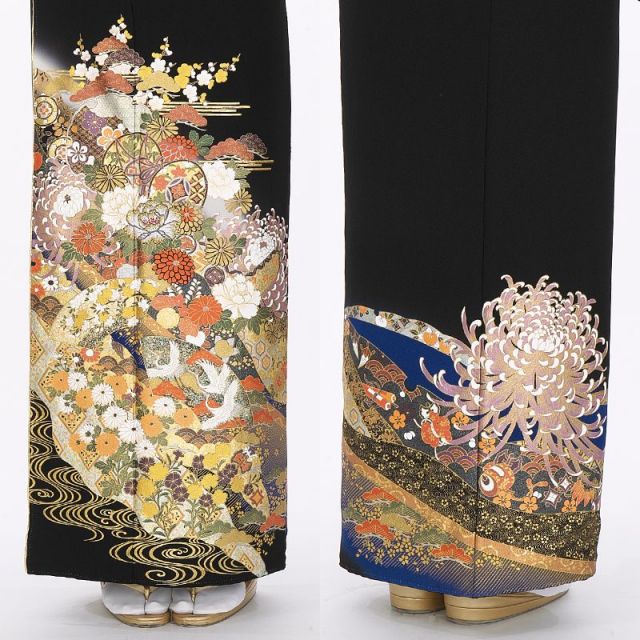 高い技術の金彩を用いた豪華な古典文様に定評のある留袖ブランドKOTOHOGI(ことほぎ)より、絢爛華麗で上品な黒留袖です。晴れの日にぴったりな日本古来のおめでたい文様がびっしりと散りばめられ、お祝いの気持ちが柄全体で感じられる心温まる1着。裾には穏やかに黄金の水面が流れ、上に上がるほど美しい文様が華やか。柄の上部には雲に隠れながら「松」・「梅」が美しく咲いているのが見えます。全体で水面から空を表し、これからの人生の繁栄を感じさせる立体感のある柄になっています。「松」は寒い冬にも緑を絶やさず、「梅」は冬に寒さに耐えながら花を咲かせることから、どちらも健康や長寿の意味を持つ古典文様です。お花の中に置かれた「鼓」は古来より雅楽の高貴な楽器として着物の文様として使われてきました。また「音が鳴る」ので、「成る」と漢字をあて、「成功」という意味も持っています。美しさと気品の象徴「牡丹」には豪華な刺繍があしらわれ高級感を醸し出しています。「牡丹」はぽってりとした可愛い大輪の花が美しいと古来から日本人に愛されてきました。背面にも大きな「菊」が満開の姿が印象的なので、どこから見ても場を華やかにしてくれること間違いなしです!