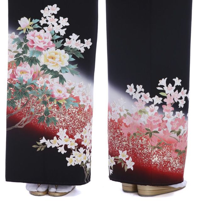 ゴージャスに散りばめられた金箔と牡丹文様の黒留袖「天香国色」は、あなたを洗練された華やぎで包みます。花びらの裏表に濃淡をつけたクリーム色の牡丹をメインに、ピンク色の牡丹が艶やかに咲き誇ります。牡丹は百花の王様。富の象徴であると同時に長寿を意味するおめでたい柄です。その牡丹を取り囲むように、チャーミングな表情のツツジが絢爛豪華な風情で置かれています。ツツジは春から夏にかけて咲く花ですが、着物柄には珍しい柄です。それだけに、洒落感のある柄ゆきになっています。特に、後ろ身ごろの裾模様が歩くたびに「天香国色」の名のように天上の香りを届けてくれるかのようなニュアンスを漂わせます。そしてなによりも、この黒留のポイントは赤とホワイトで表現された天の川のような色の配置に、天空に煌めくお星様のように散りばめられた金箔です。ゴージャスに香り立つ花々に気品を託した黒留は、お祝いの気持ちを奥ゆかしく表現してくれます。
