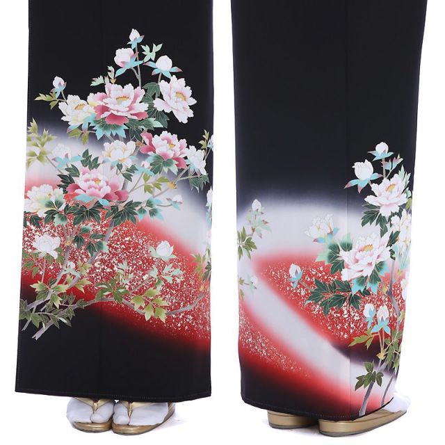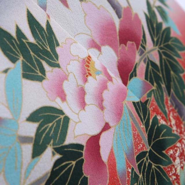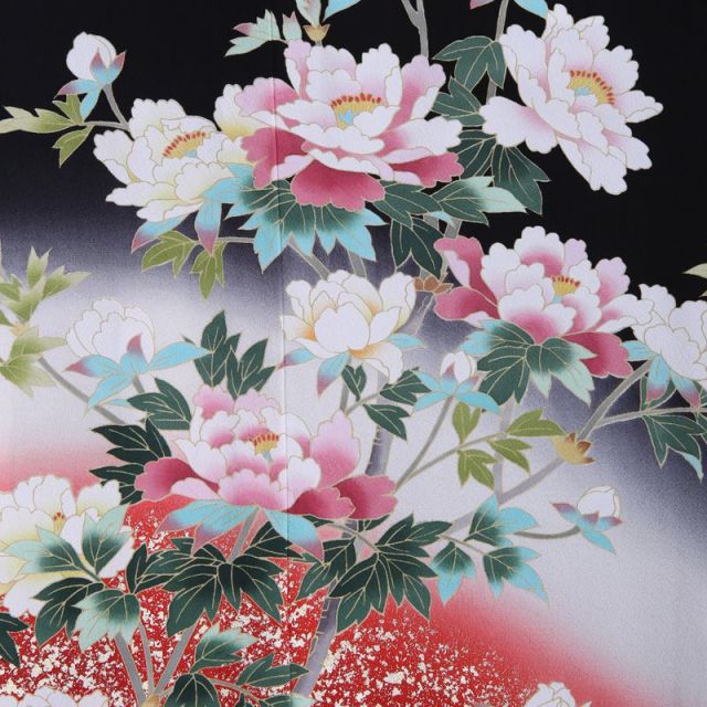 このお着物に描かれているのは“牡丹”。牡丹の花は奈良時代に中国から伝わり、中国では昔からその豪華な花の姿から「百花の王」と呼ばれていました。日本でも奈良時代以降に伝わり、多く栽培されるようになりその美しい花の姿が大変好まれ、着物にも多く描かれるようになりました。 花びらが幾重にも重なり、大きな花を咲かせる牡丹は「富貴」の象徴とされています。また「立てば芍薬、座れば牡丹、歩く姿はユリの花」という言葉があるように、女性の美しさを表現しています。牡丹の堂々と咲くさまは、凛とたたずむ美しい大人の女性のようですね。グラデーションで牡丹の花を包むような赤色が幻想的で優雅な雰囲気を演出します。赤色は情熱的で力強いイメージもありますので若々しさも付け加えてくれます。牡丹の美しさで華やさを演出する一着です。