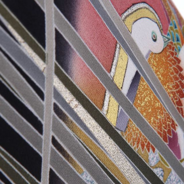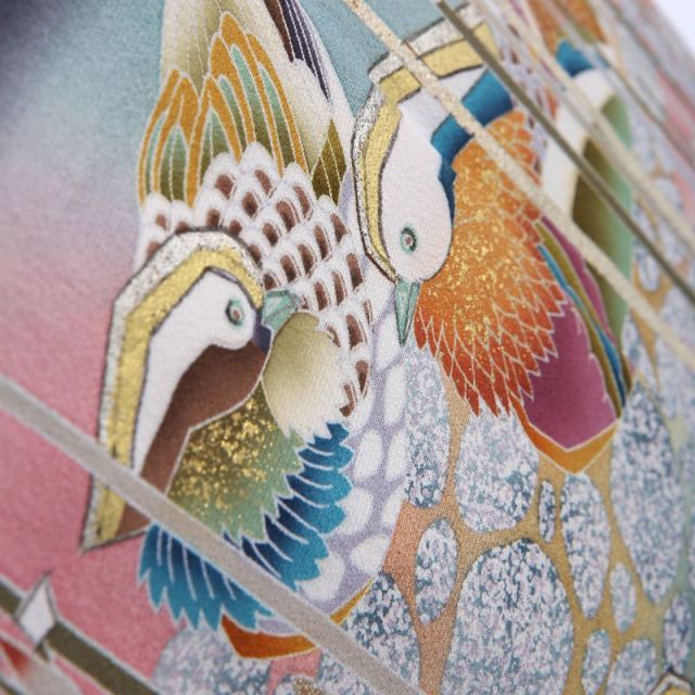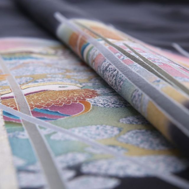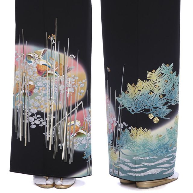 水辺に浮かぶのは“鴛鴦(おしどり)です”。仲の良い夫婦のことを指す「おしどり夫婦」という有名な言葉があるように、雄と雌が仲良く“つがい”でいることが多い鴛鴦は「いつまでの仲の良い夫婦」、「夫婦の変わらぬ愛」のシンボルとして古くから着物の柄に描かれてきました。色鮮やかに描かれた姿は非常に可愛らしく、水辺を泳ぐ姿がなんとも美しく優雅です。穏やかな水辺は柔らかな色彩で描かれ、鴛鴦たちを優しく包むように見守ります。後身に描かれた“若松”は新鮮で若々しく描かれ、“まつぼっくり”が可愛らしく描かれているのも印象的。厳しい寒さの冬を越え1年を通して常緑を保ちつづける松は不老長寿の象徴とされ、お着物によく描かれる吉祥文様です。優しく穏やかな絵柄に包まれ、優雅な雰囲気を演出できる一着です。