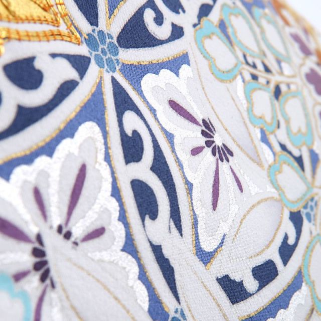 吉澤友禅は、老舗メーカー『吉澤織物』が展開する高級ブランドです。京友禅や加賀友禅、江戸友禅とならぶ友禅染の代表格です。長い歴史の中で染匠たちによって代々受け継がれた伝統を守りつつ、時代の流れに沿ったデザインの着物を生み出しています。そのデザイン性や品質の高さから大人の女性たちから人気を博し、日本全国の百貨店や着物専門店で取り扱われています。吉澤友禅では絵柄がすべて手加工にて施され職人たちの技術が、その鮮やかな彩りと重厚感のある光沢を生み出しています。こちらのお着物では“桐(きり)の葉”に金の刺繍が施され、繊細で緻密な美しさを放っています。桐は中国の故事で伝説の鳥「鳳凰(ほうおう)」が桐に棲むという話が日本に伝わり、縁起が良くおめでたい花として扱われてきました。また桐文は高貴なものとされており、天皇の紋章としても使用されてきました。桐文は本来、「皇室専用」のものとされ大変高貴な扱いだったのです。また、菊の花を菱形に配置した「菊菱文」は青色で描かれモダンでおしゃれな雰囲気も感じます。伝統美を感じながらもスタイリッシュに着こなせる一着です。